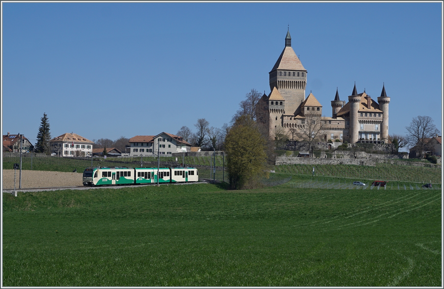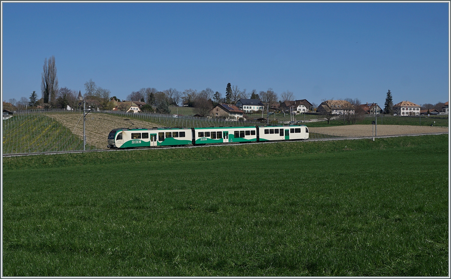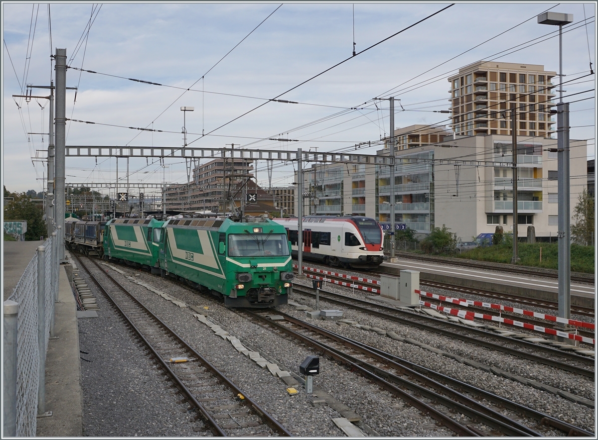 Der BAM MBC Te III 147 schiebt in Morges die normalspurigen Kieswagen auf die Rollbockanlage, während links im Bild eine BAM MBC Regionalzug auf die Abfahrt nach Bière wartet.