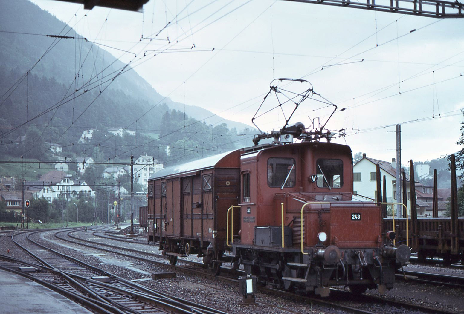 Die SBB Re 4/4 I 10039 beim Halt in Moutier mit einem Schnellzug von Biel/Bienne nach Delémont. Im Hintergrund sind Autotransportwagen zu sehen, welche von Region Belfort via Delémont Moutier und Gänsbrunnen ins Schweizer Mittelland fahren.