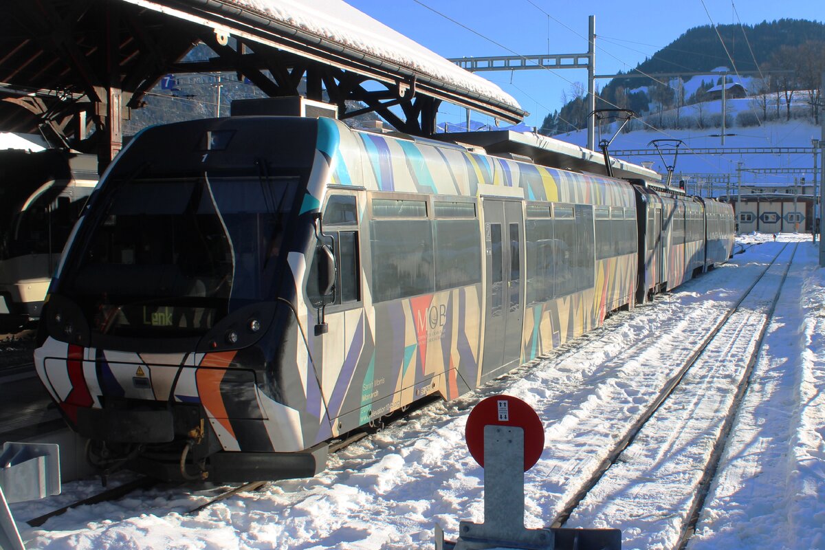 Die MOB Ge 4/4 8002 hat den GPX Interlaken Ost - Montreux im Bahnhof von Zweisimmen übernommen; dies erwähnte ich ja bereits beim vorhergehenden Bild, dieses Bild hier zeigt ein faszinierendes Detail: die Ge 4/4 steht auf den Schmalspurgleisen, die Wagen aber (noch) auf den Normalspurgleisen.