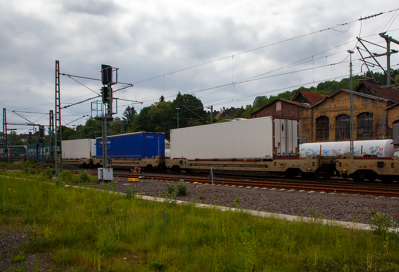 Die BLS Cargo 015, Re 485 015 (91 85 4485 015-2 CH-BLSC) fährt am 23.03.2021 mit einem CargoBeamer Alpinzug Domodossola- Kaldenkirchen, durch Betzdorf (Sieg) in Richtung Köln.