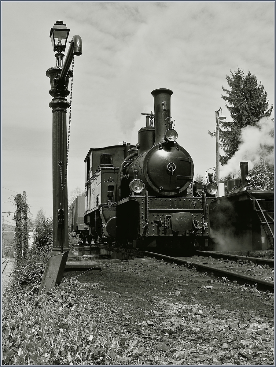 von Links nach Rechts: Die (damals) 90 Jahre alte SEG G 2x 2/2 105 (1918), in der Mitte die die 1889 gebaute RhB G 3/4 N° 1 und ganz rechts die etwas jüngere JS/BAM G 3/3 N° 6 in Chaulin vor dem "alten", wenig attraktiven Schuppen.