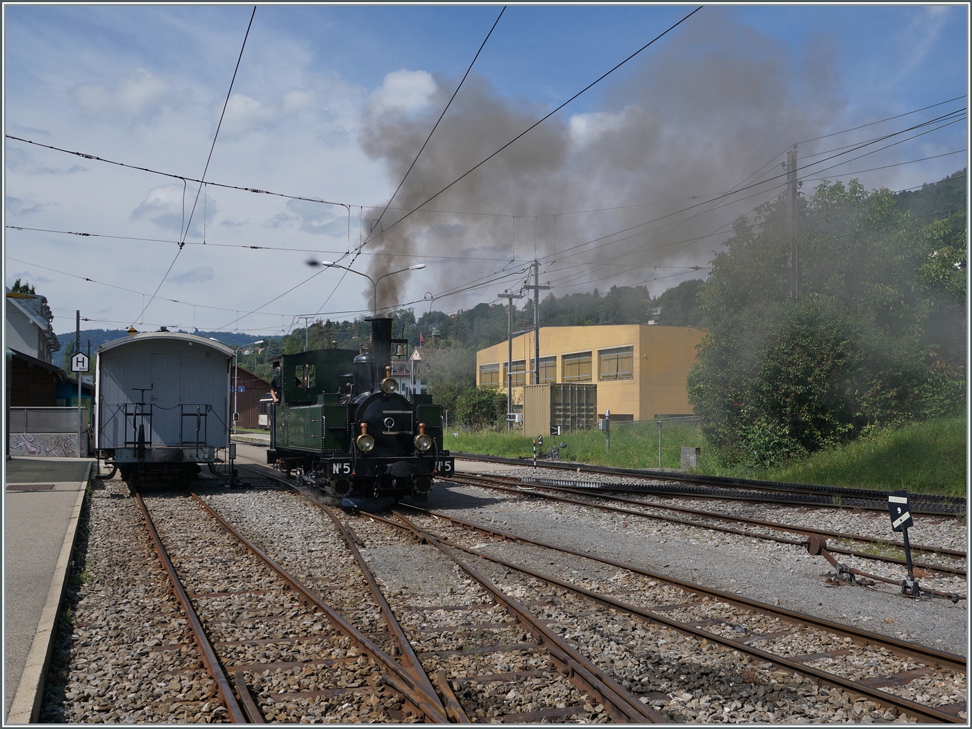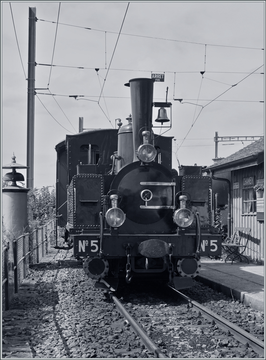 Die 1890 gebaute LEB G 3/3 N° 5 der Blonay Chamby Bahn wird in Chaulin mit Kohle und Wasser versorgt.