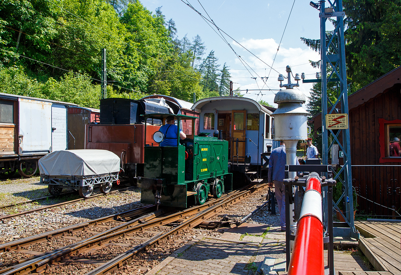Die MOB V 121 zeigt sich herrlich bunt! am 27. Juli 1955 von Deutz unter der Fabriknummer 55736 als A6M517R bez. V 22 an die Euskirchener Kreisbahn geliefert, wurde die Lok 1972 auf Normalspur umgebaut und nach dem Kauf durch die MOB 1984 wieder auf Meterspur.