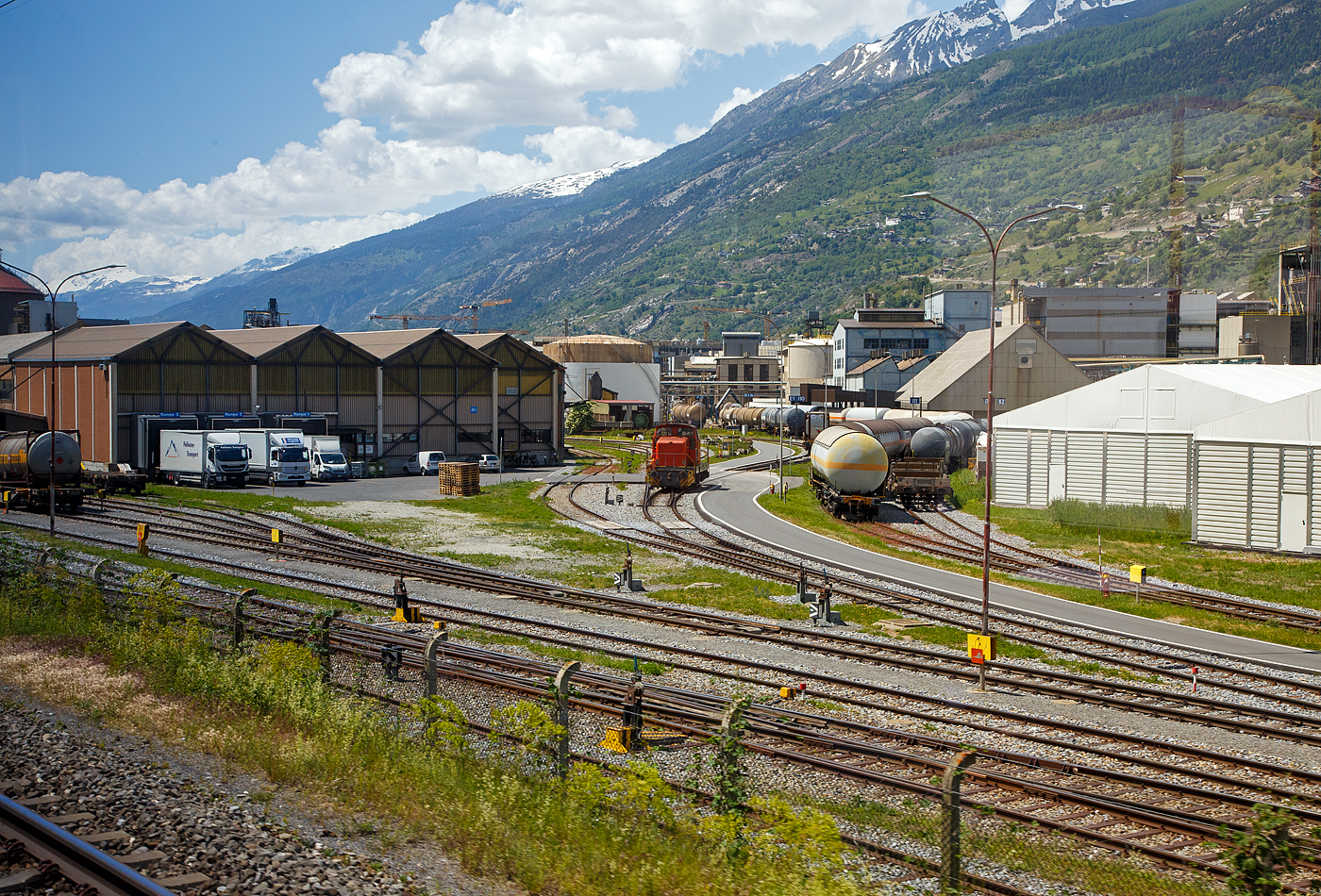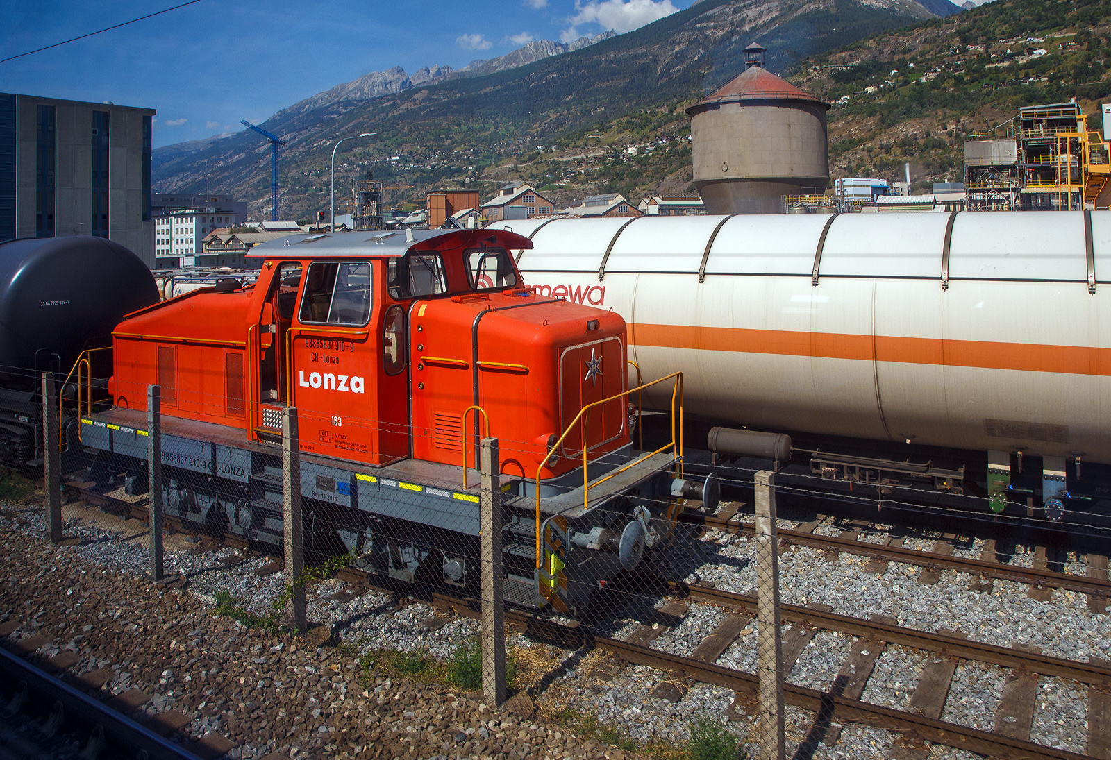 Aus dem Zug heraus, die Em 3/3 163 "Rene" (98 85 5837 910-9 CH-LONZA) eine Henschel DHG 500 C der Lonza AG (Visp), steht am 08.09.2021 in Visp.