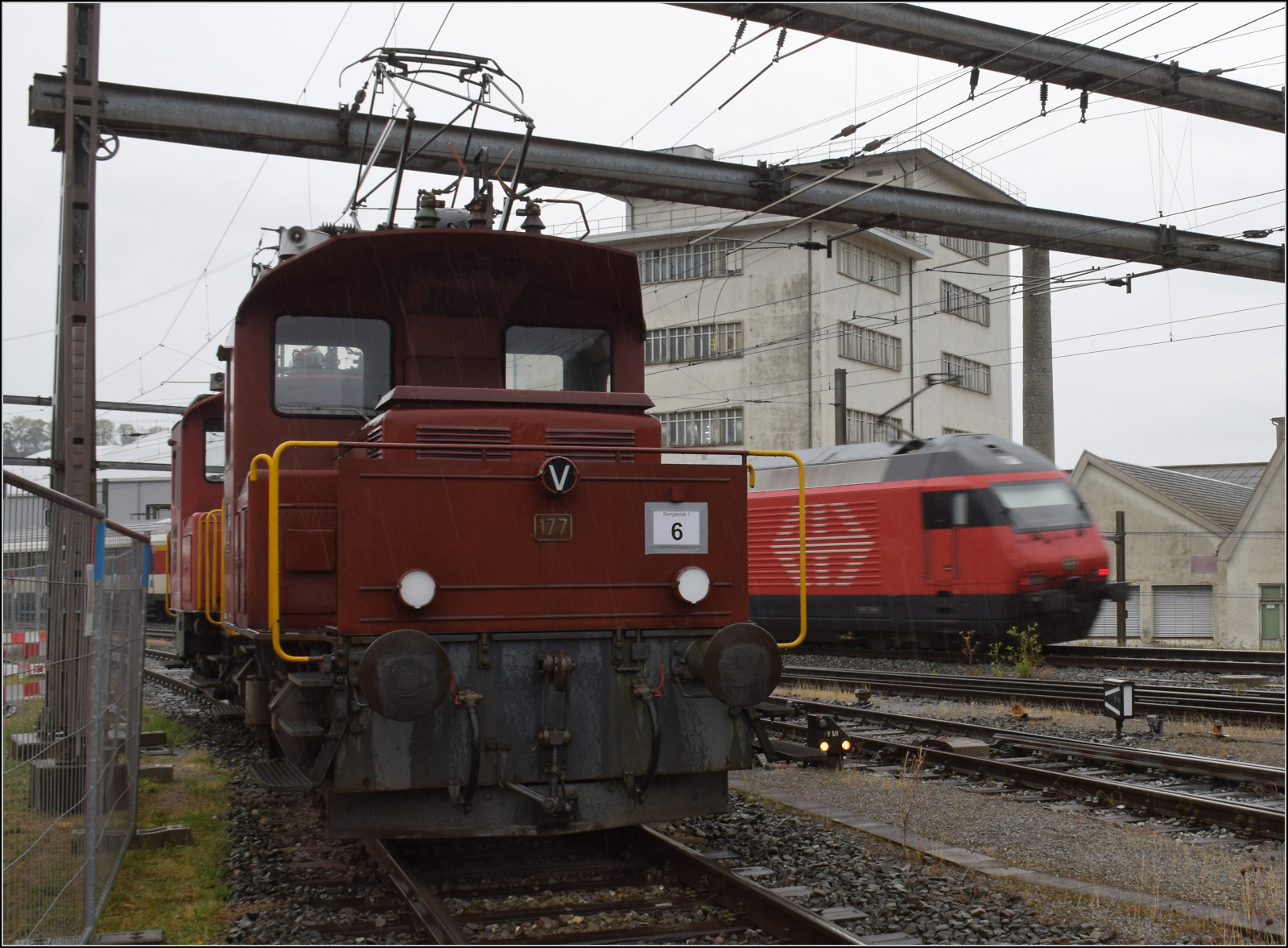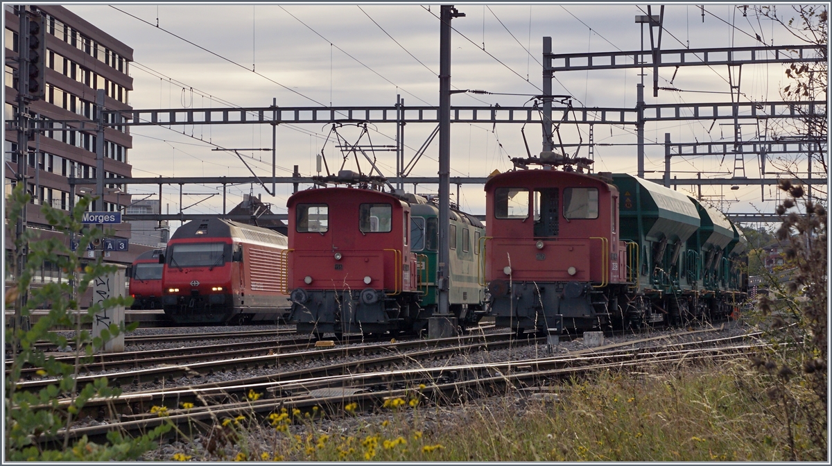 Zwei von drei BAM MBC Rangierloks in Morges: Rechts die Te 2/2 III 147 und links die Tem III 329 (97 85 1 220 329-7), welche ein Neuzugang zu sein scheint.