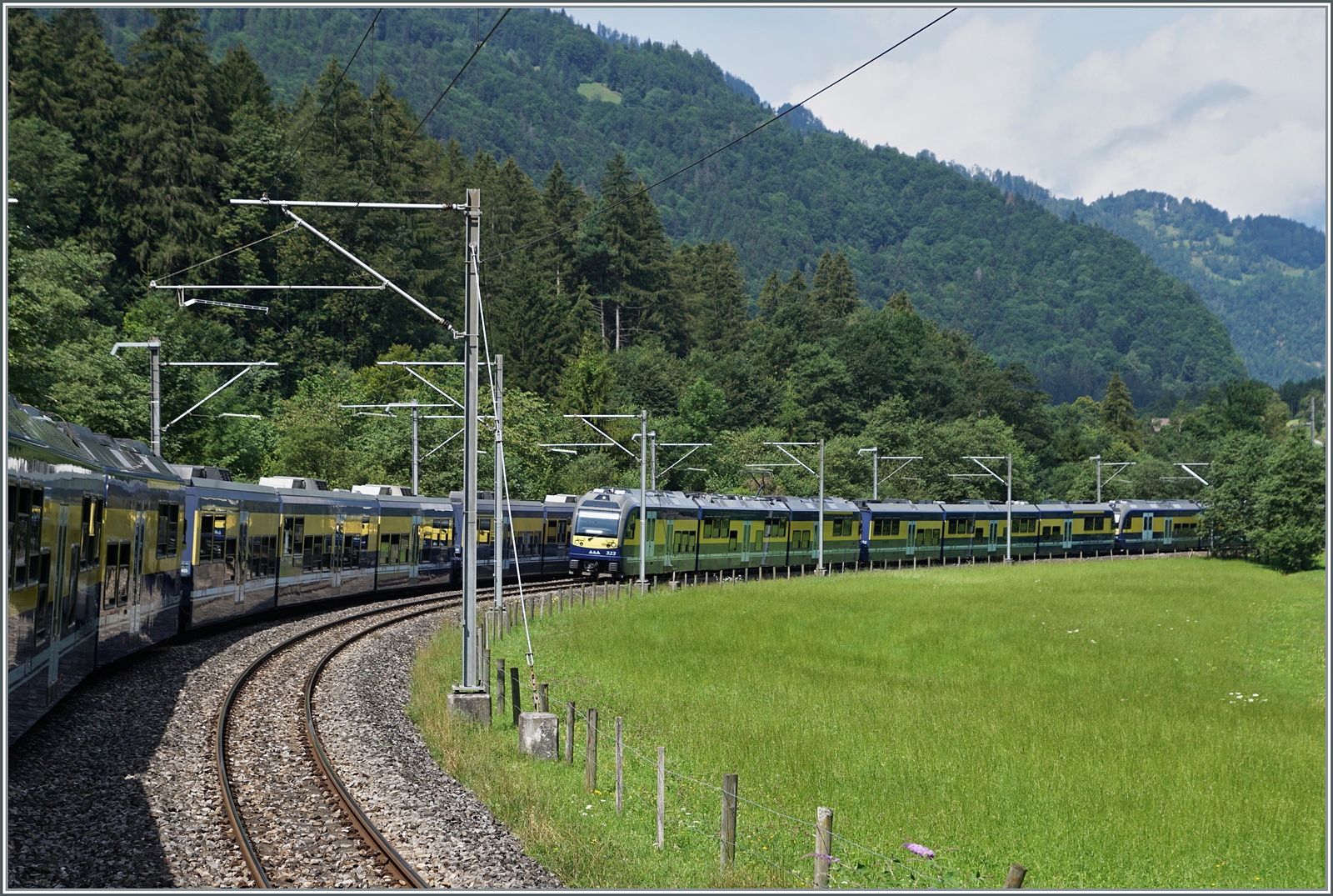 Wie gut kann man in den BOB Züge die meisten Fenster öffnen, dies übrigens auch in den neuen Triebzügen. So konnte dieses Bild aus dem fahrenden Zug von Lauterbrunnen/Grindelwald nach Interlaken auf der Doppelspur kurz nach Zweilütschinen entstehen und zeigt mit welch grossen Kapazitäten hier im Halbstundentakt riesige Menschenmassen transportiert werden.