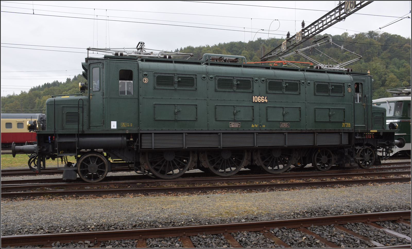 Depotfest Olten 2023. Kaum waren alle Gäste da, ging der Regen los. Gemeint sind auch die auf der Schiene angereisten Gäste mit den vielen Stahlrädern. Der Stimmung tat es keinen Abbruch. Wer sich in den Regen gewagt hatte, wurde mit ungestörtem Blick auf die Exponate belohnt. Im Bild sind vereint von links: Ae 8/14 mit der Schnauze, Ae 3/6 I 10664, Ae 6/6 11415 'Aargau', Ae 3/6 II 10469, Ae 3/5 10217, Ae 4/7 11026 und Ae 3/6 III 10264. August 2023. Wer die Bilder des Depotfests zusammenhängend sehen möchte, kann auf diesen Link klicken: http://igschieneschweiz.startbilder.de/bild/vereine~sbb-historic~ae-36-iii-10264/847572/depotfest-olten-2023-die-mittlere-scheron.html