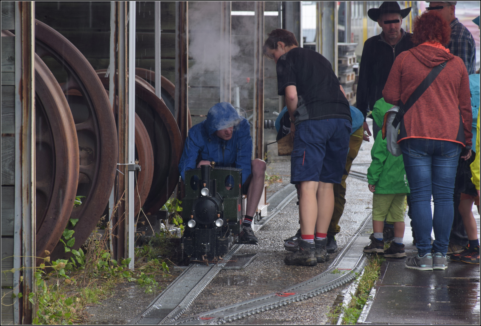 Depotfest Olten 2023. Auch an die Kleinen war gedacht mit einer Dampfmodellbahn. Da die ganz Kleinen weniger wasserfest waren, konnten sich die Grossen und Mittleren auf der Strecke austoben. August 2023.