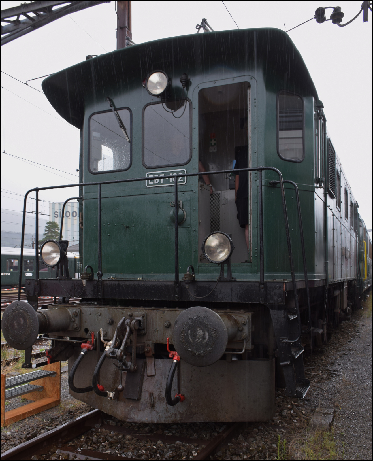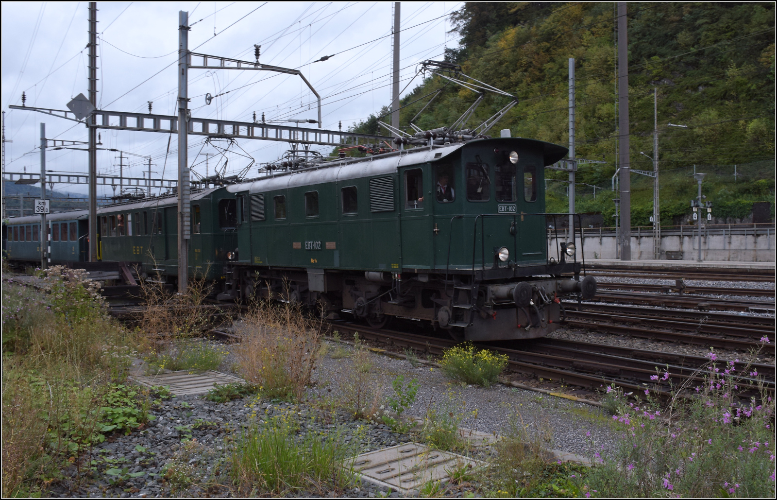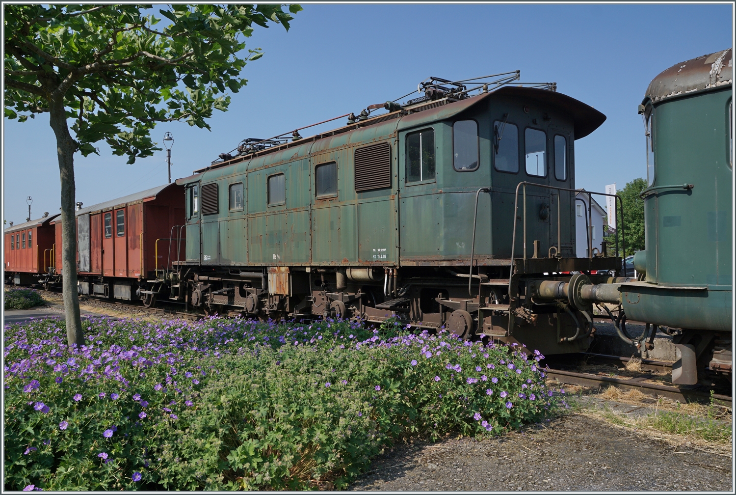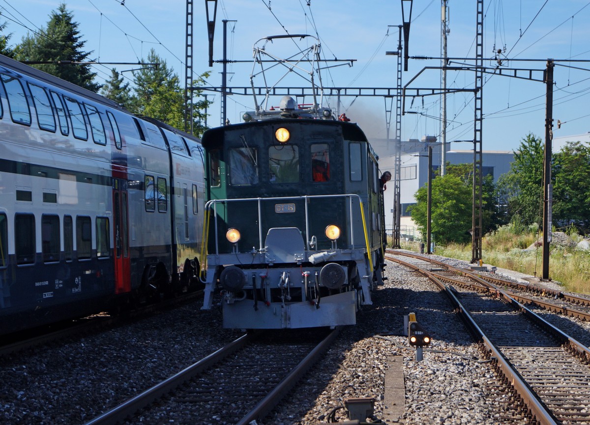 BDWM/DVZO/DBB: Ueber das Wochenende vom 26. bis 28. Juni 2015 verabschiedete sich die BDWM nach 140 Jahren vom Anschluss an das Europäische Normalspurnetz, weil durch die Aufhebung des Güterverkehrs auf normaler und schmaler Spur das Dreischienengeleise zwischen Wohlen und Bremgarten West nutzlos geworden ist. Mit dem WESCHTFÄSCHT und vielen Sonderfahrten nahmen Schüler und eine grosse Anzahl Festbesucher Abschied vom Dreischienengeleise auf diesem reizenden Streckenabschnitt. Am 28. Juni 2015 brachte die DVZO Be 4/4 15, ehemals BT die DBB Eb 3/5 5810 "HABERSACK", ehemals SBB von Wohlen nach Konolfingen zur DBB zurück. Die Aufnahme entstand bei Roggwil im sommerlichen Abendlicht.