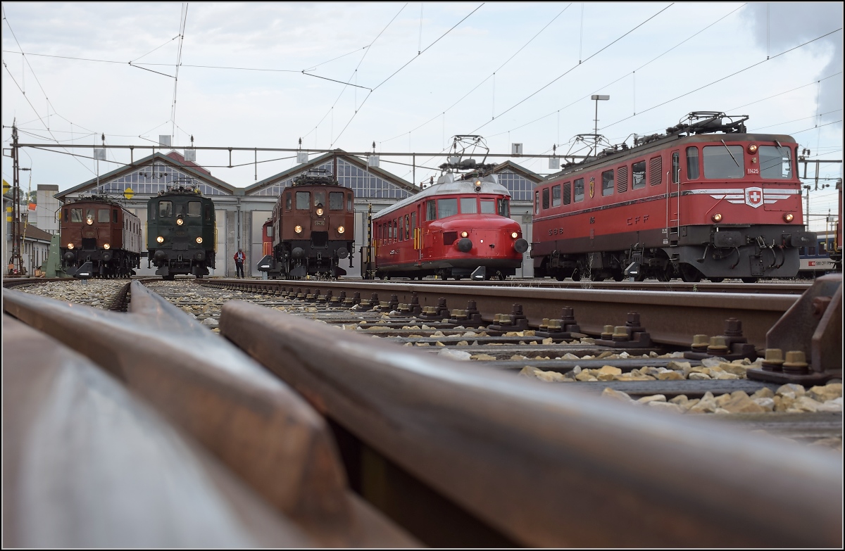 Rund um das alte SBB Depot Erstfeld, das durch die Eröffnung des Gotthard Basistunnel leider seine grosse und langjährige Bedeutung verliert, wurde Rollmaterial aus verschiedensten Epochen ausgestellt so auch die Be 4/7 12504. Aufnahme vom 4. Juni 2016.