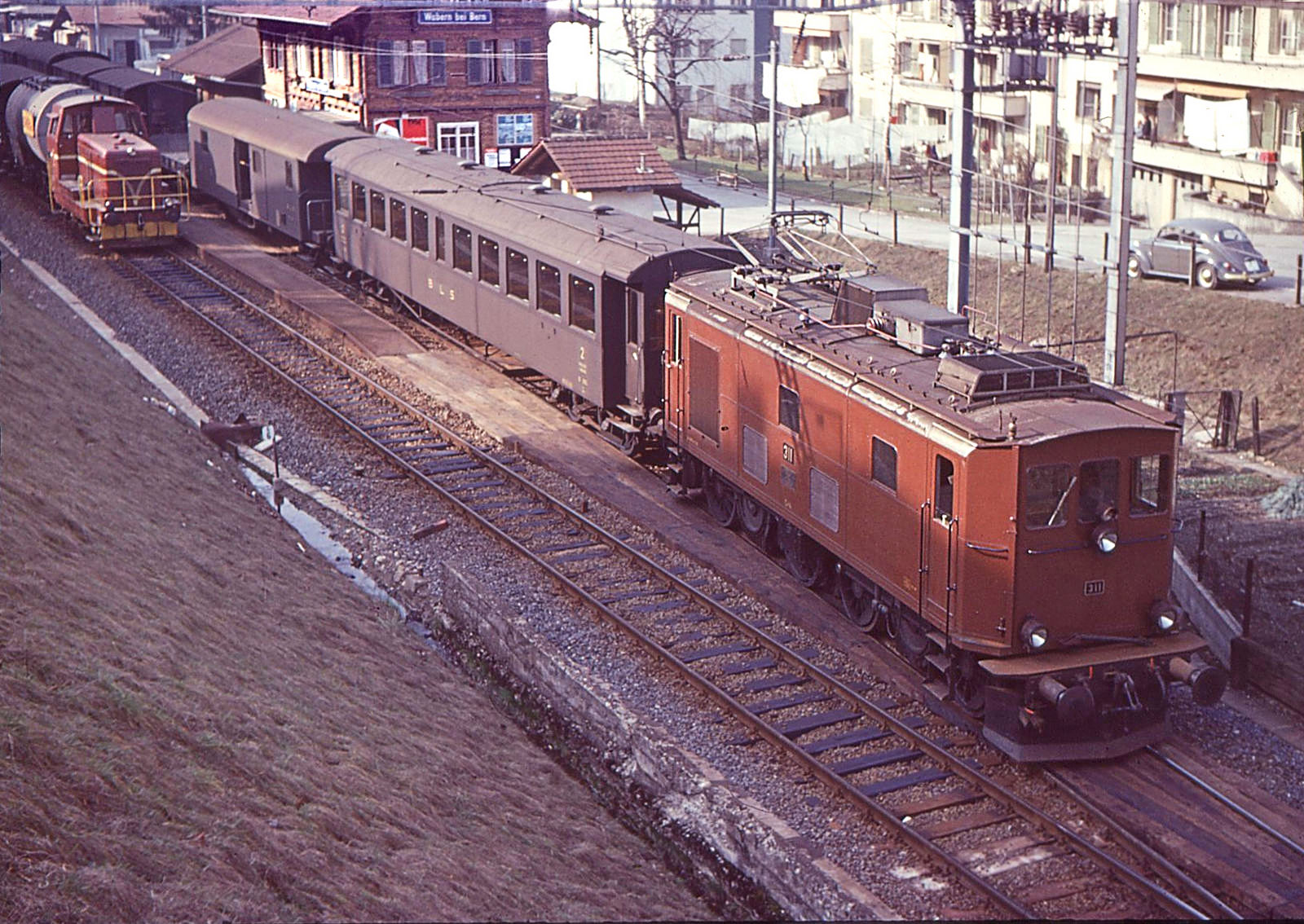 Schwere Altbauwagen der BLS: 1911/12 beschaffte die BLS 32 Wagen für den internationalen Verkehr mit Seitengang (20 AB4 und 12 C4) und 1914 für den innerschweizerischen Verkehr 9 C4 mit Mittelgang. Sie hatten Holzkasten mit Metallverkleidung. Ende 1940er/Anfang 1950er Jahre wurden 25 Seitengangwagen nach Umbau zu Mittelgangwagen. Einige dieser alten Wagen waren in den 1960er Jahren noch vorhanden. Im Bild steht Ce 4/4 311 mit einem Güterzug in Wabern, an erster Stelle ein alter BLS-Vierachser, möglicherweise B 885; ich vermute, er hat noch Holzkasten mit Metallverkleidung. Wabern, 8.März 1967. (Links noch die alte Gaswerkbahn Bern)