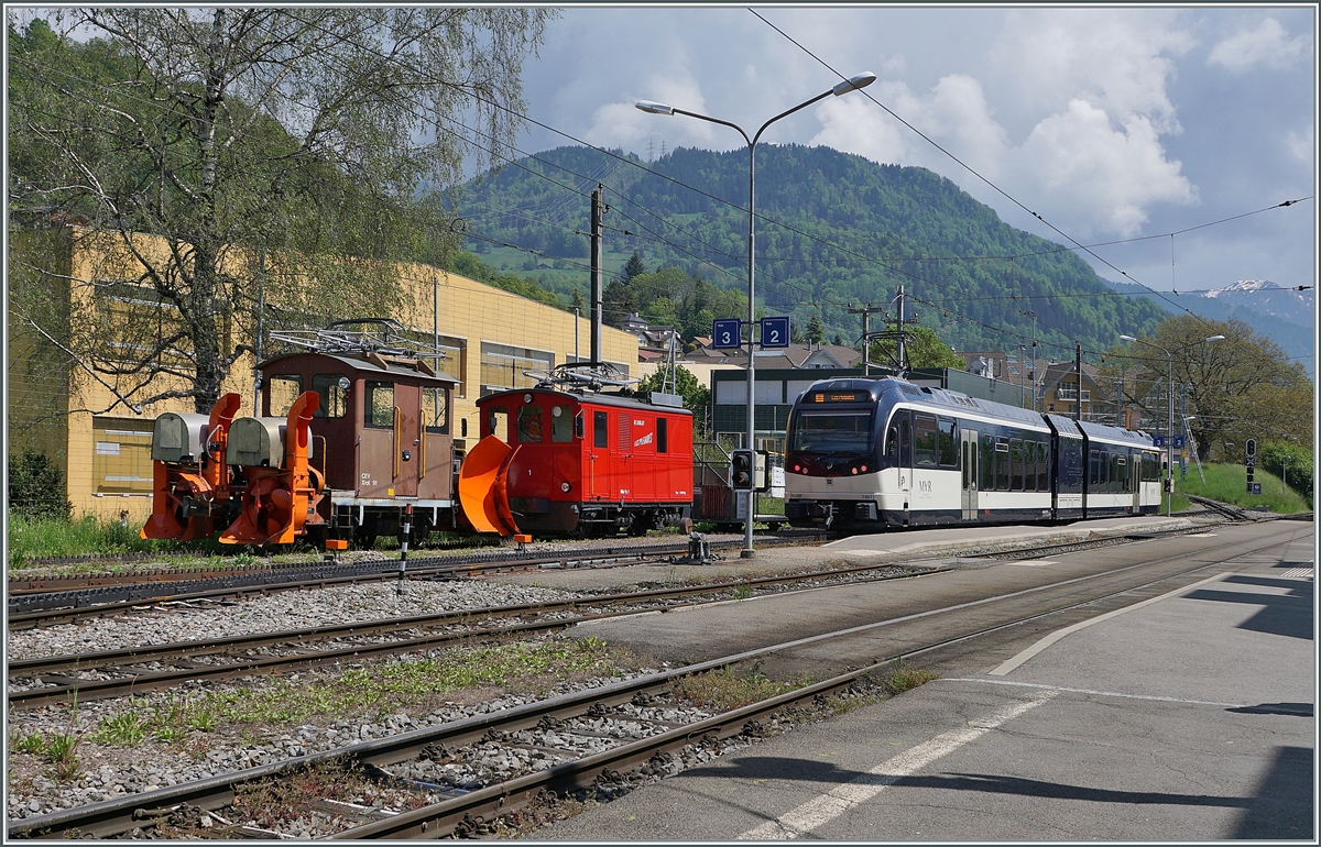 Nach der getanen Arbeit auf der Strecke zum Les Pléiades zieht die CEVC HGe 2/2 die Xrot 91 in Blonay in den Schuppen. (Dort drin steht übrigens noch die zweite HGe 2/2, wie ich kürzlich gesehen habe).