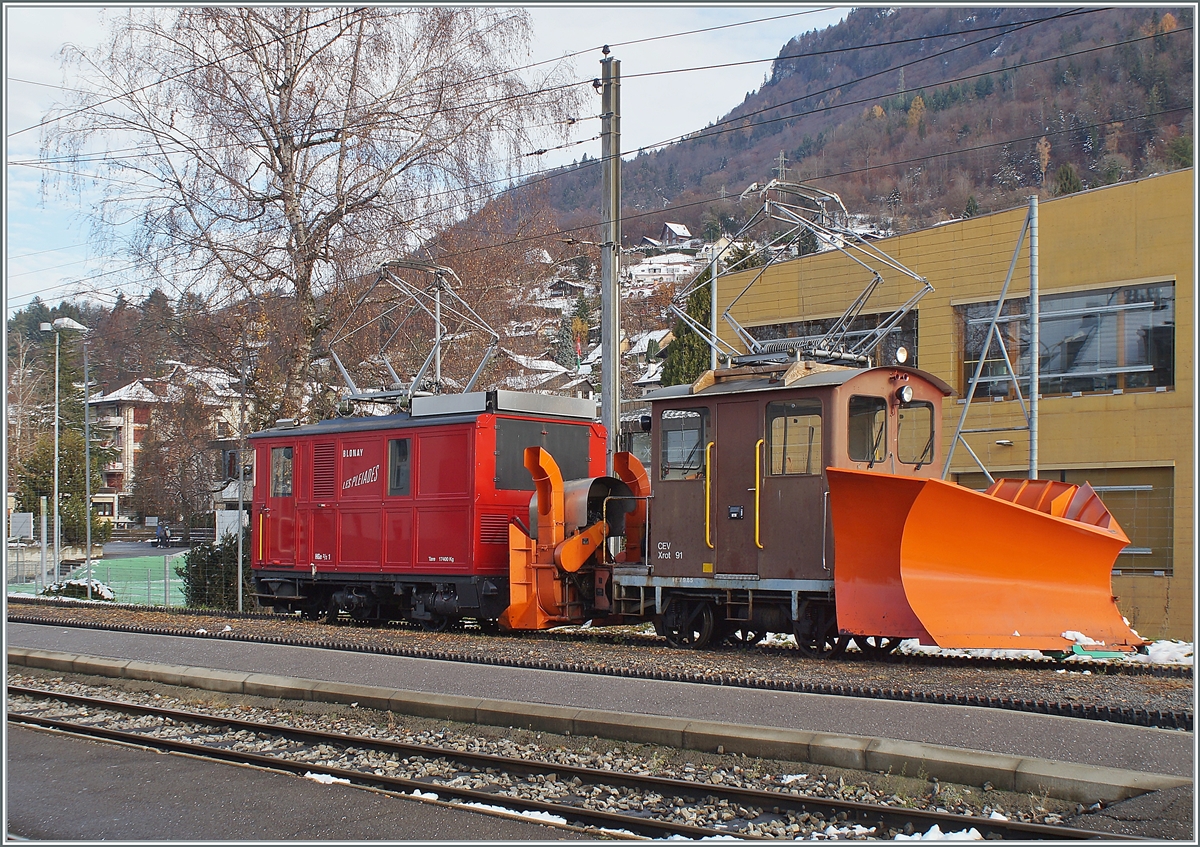 Ein Zugsuchbild: Neben der unübersehbaren CEV HGe 2/2 N° 2 findet sich gut versteckt auf dem Bild noch ein MVR ABeh 2/6 beim Halt in Prélaz-sur-Blonay.