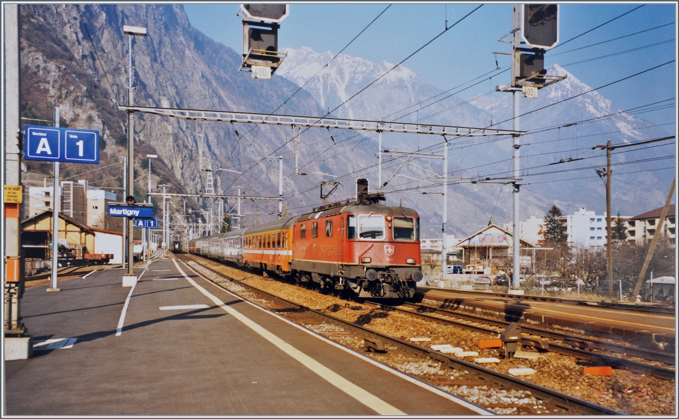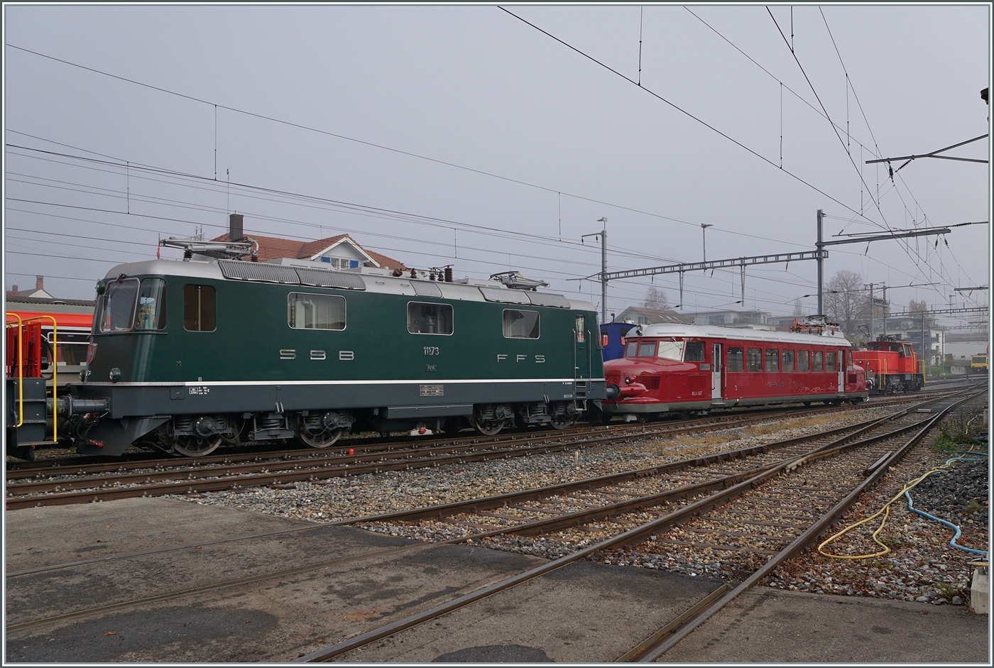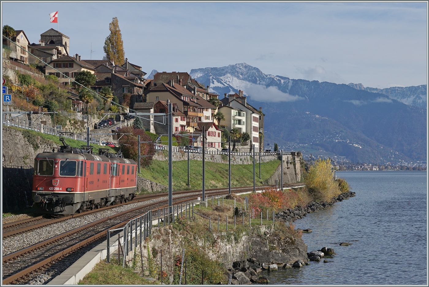 In der von der hinter meinem Rücken langsam untergehend Sonne schon etwas rot gefärbten Landschaft des Lavaux ist die SBB Re 4/4 II 11294 (Re 420 294-1) "100 Jahre Zirkus Knie" mit einem Güterzug auf dem Weg in Richtung Lausanne. 15. November 2024