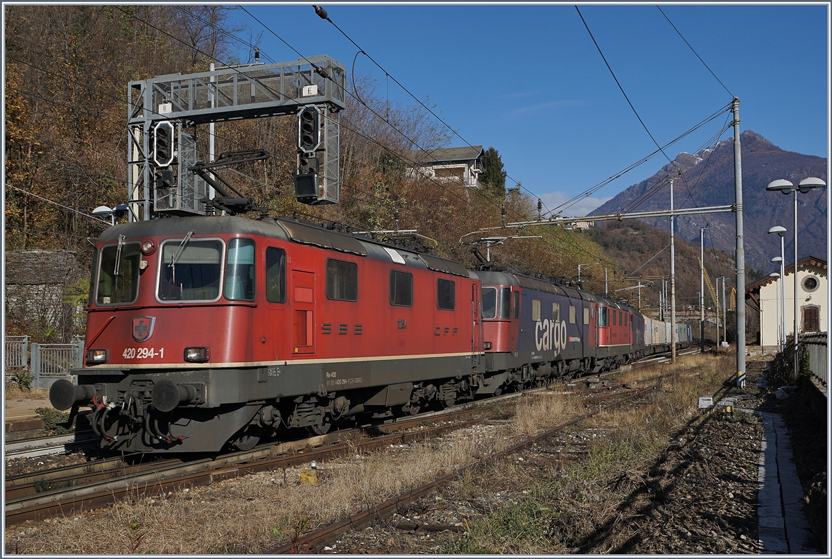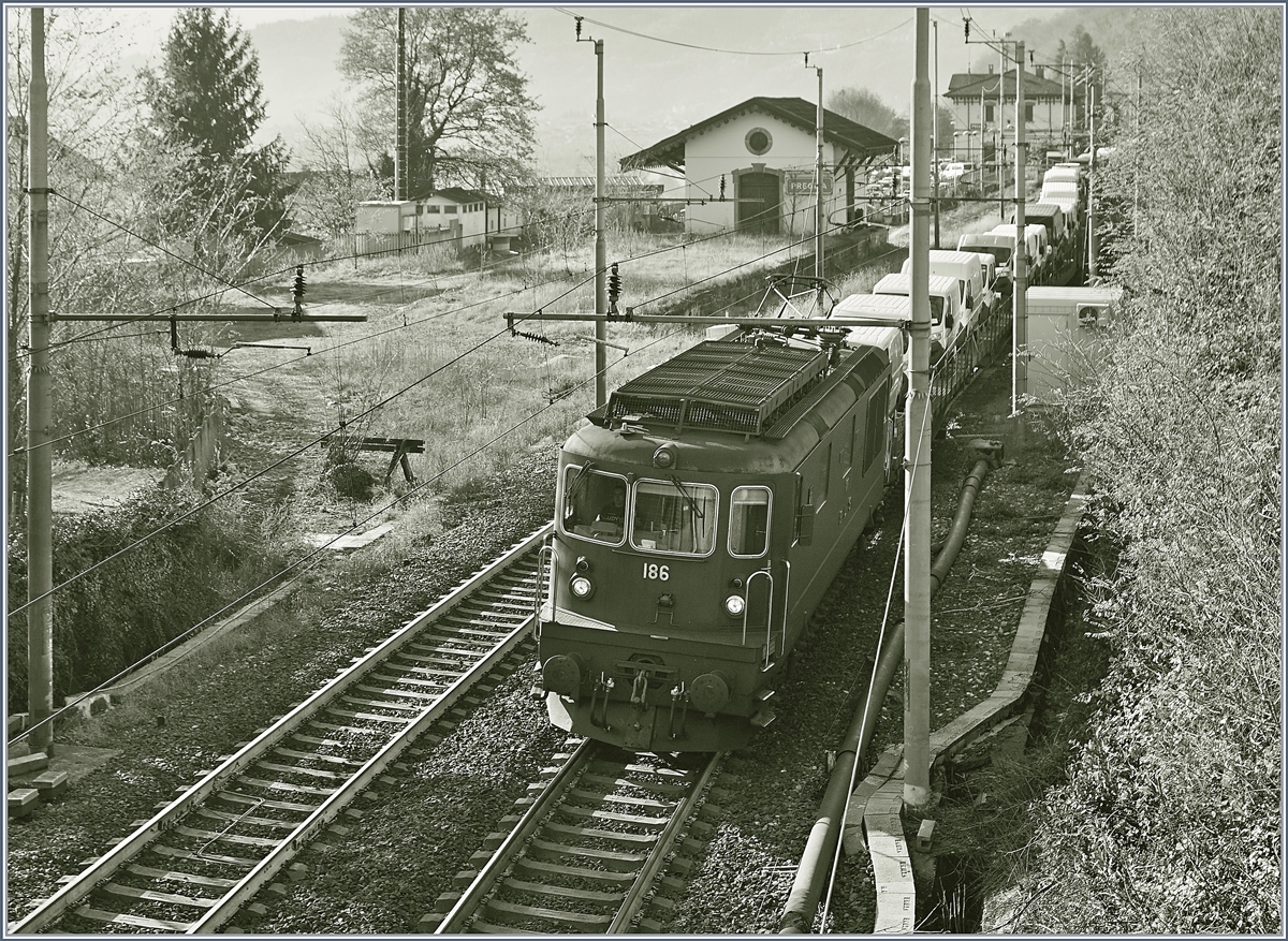 BLS Re 4/4 181 - 189 ab 1974; bei Preglia zieht die Re 4/4 186 "Leissigen" einen Güterzug in Richtung Norden.