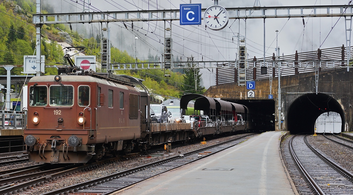 Die BLS Re 4/4 192 ist mit ihrem Autotunnelzug in Iselle angekommen und wartet nun uaf die baldige Rückfahrt.