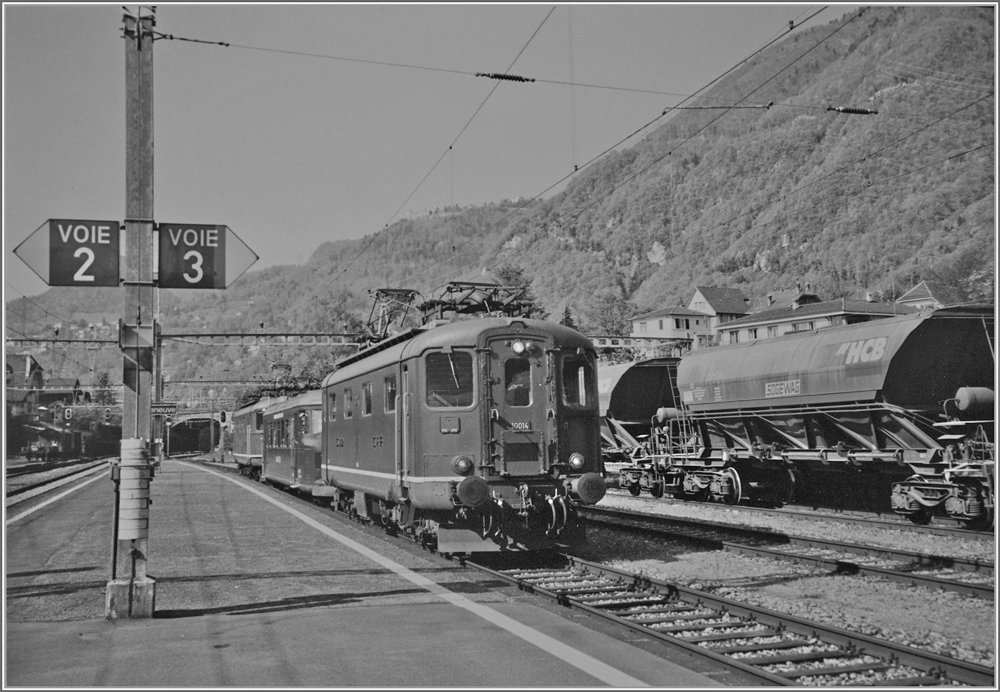 Die SBB Re 4/4 I 10039 beim Halt in Moutier mit einem Schnellzug von Biel/Bienne nach Delémont. Im Hintergrund sind Autotransportwagen zu sehen, welche von Region Belfort via Delémont Moutier und Gänsbrunnen ins Schweizer Mittelland fahren.