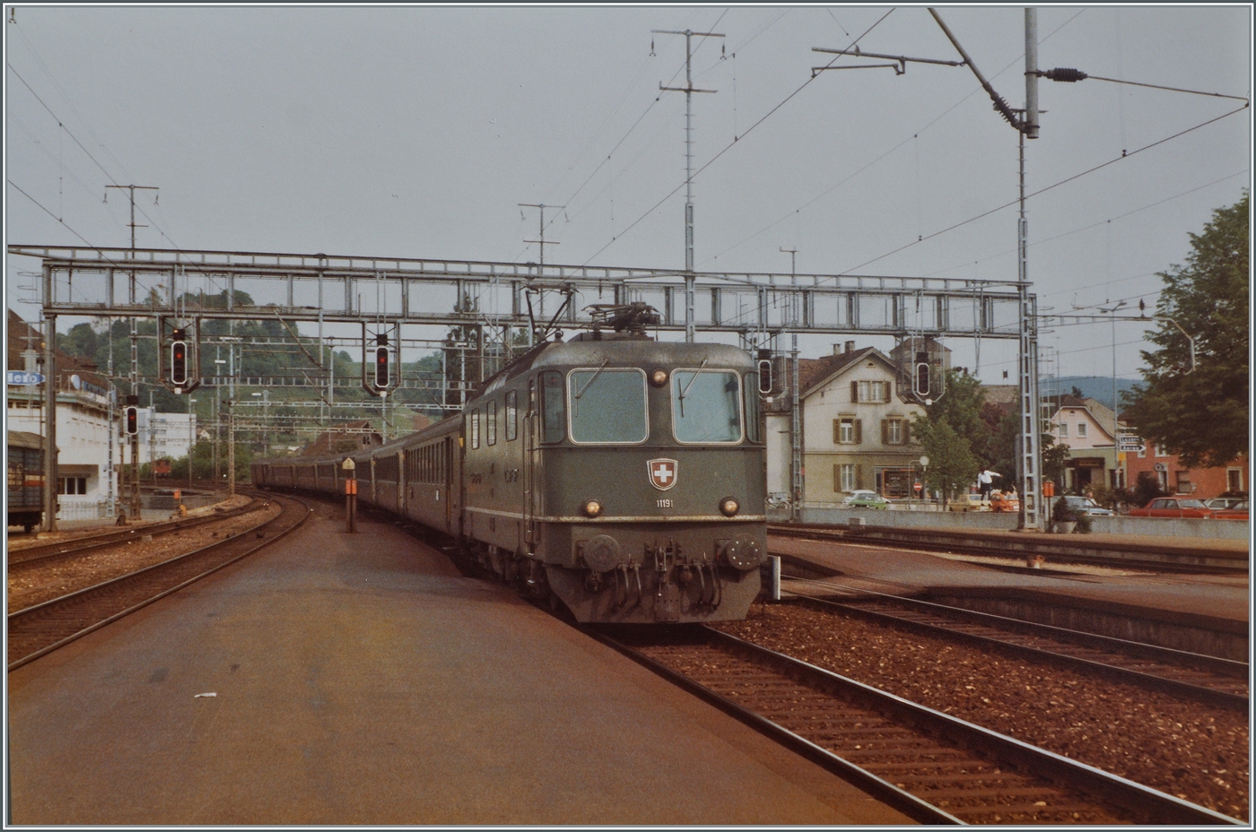 Die SBB Re 4/4 II 11162 hält mit ihrem Regionalzug nach Arth Goldau in Wohlen kurz an. Neben der Lok sind natürlich besonders die damals im Regionalzugverkehr eingesetzten Wagen von Interesse und, ganz selbstverständlich steht am Güterschuppen ein gedeckte Güterwagen zum verladen von Stückgüter, dank RIV EUROP konnten damals alle Wagen der teilnehmenden Bahnen freizügig verwendet werden.