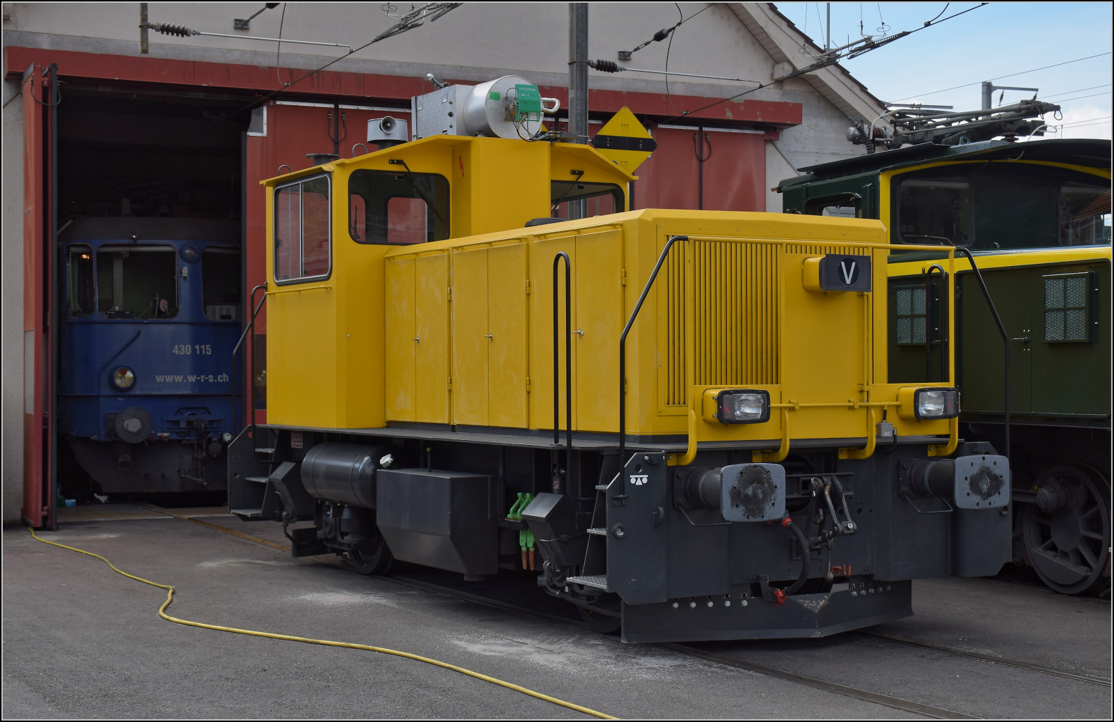 Crossrail Re 4/4 III (bzw. Re 436 112-7) mit einer Schwesterlok und einem langen Güterzug auf der Fahrt Richtung Norden bei der Durchfahrt in Varzo.
