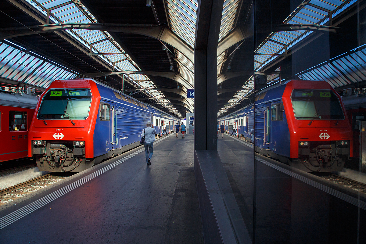 Die SBB Re 450 114-4 " Dänikon" (91 85 4 450 114-4 CH-SBB) steht am 06.Juni 2015 mit einen Doppelstock-Pendelzug der Zürcher S-Bahn als RE nach Aarau in Zürich HB bereit. Die Lok ist die letzte (Baujahr 1997) von 115 Stück gebauten Loks.