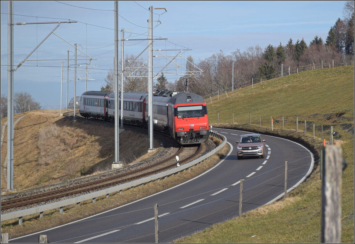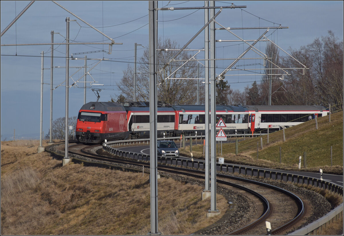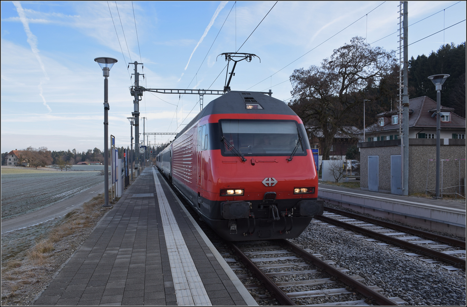 Kurz nach dem Halt in Aigle fährt die Re 460 046-6 mit ihrem IR 1711 von Genève Aéroport Richtung Brig weiter. Rechts im Bild die TPC (AOMC) Meterspurstrecke Richtung Champéry.