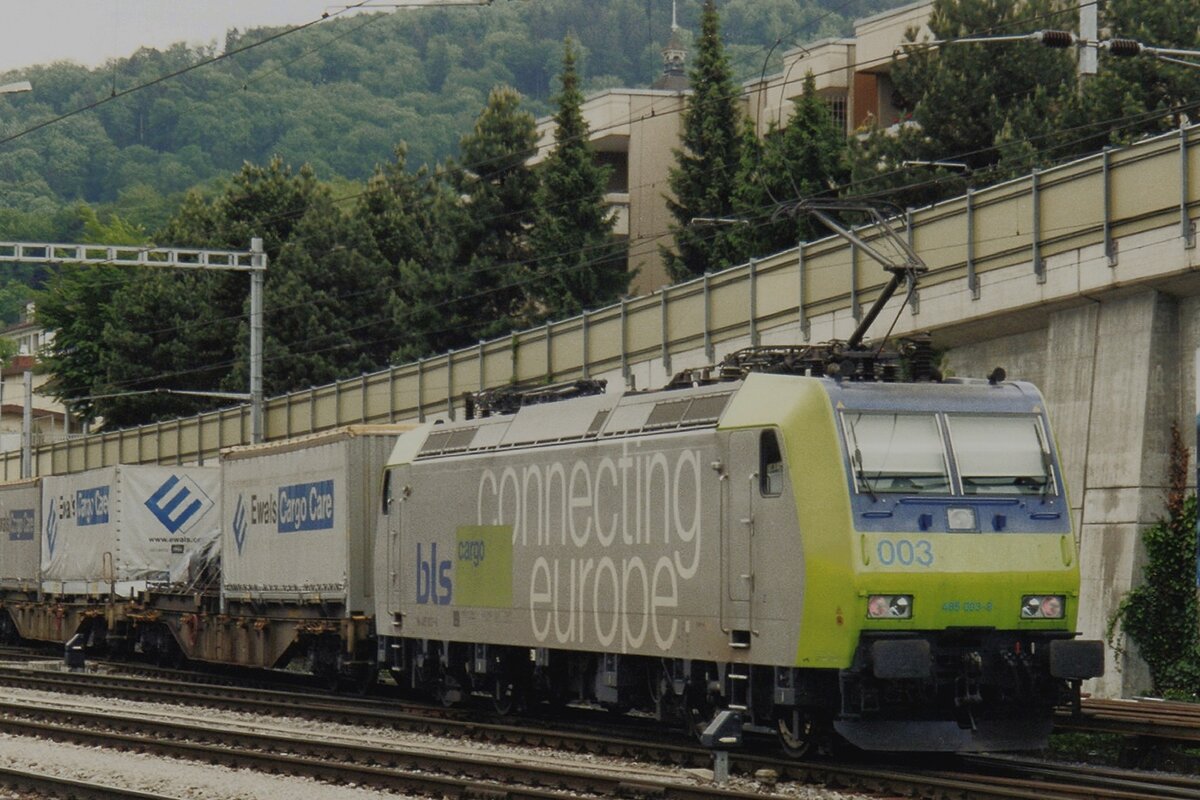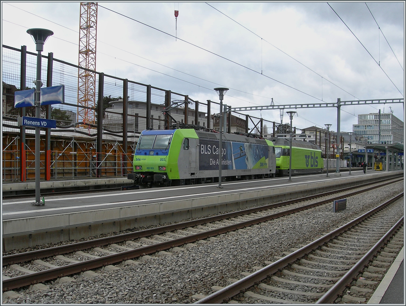 Über die Geleise und als Nachschuss zeigt das Bild die als Lokzug in Renens VD vorbeifahrenden BLS Re 465 006 und Re 485 003.