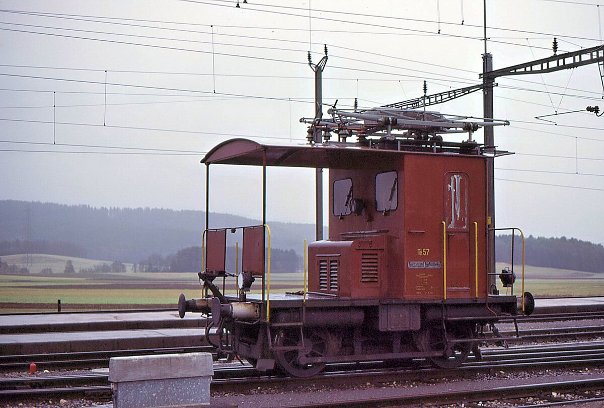 Traktoren Te I (Normalspur): Elektrische Traktoren gibt es praktisch nur in der Schweiz; im Ausland sind kleine Anschlussgeleise und Rangiergeleise nicht in so hohem Grad elektrifiziert. Die kleinen Te I sind rund 5, 6 m lang, wiegen 13 ~ 14, 5 t und erbringen 125 ~ 135 PS. Erbaut wurden sie von SLM und MFO; einige Fahrzeuge haben einen Kasten von der Fa. Tuchschmid in Frauenfeld. Die SBB erhielt zwischen 1937 und 1957 die (späteren) Nummern 1 bis 60 für den Rangierdienst und 951 – 963 für den Baudienst. Die EBT bekam 1944 – 1955 die Loks 21-29, die VHB noch 1963 die Nr. 61. Die BLS erhielt 1950/54 die Loks 11-17, bei denen dann die Westinghouse Luftbremse durch eine Oerlikon-Anhängerbremse ersetzt wurde. - Bild: Te I 57 in Glovelier, 3.Januar 1984