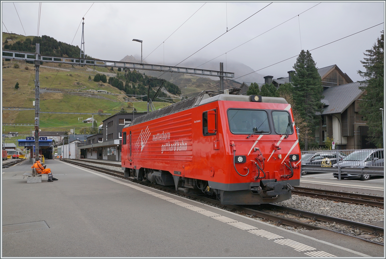 Die letzte, die Tunnellokomotive MGB Ge 4/4 III - 81 „Wallis“ der Matterhorn-Gotthard-Bahn ex FO Ge 4/4 III - 81, steht am 07.09.2021mit einem Furka-Autoverladezug beim Bahnhof Realp (1.538 m ü. M.).