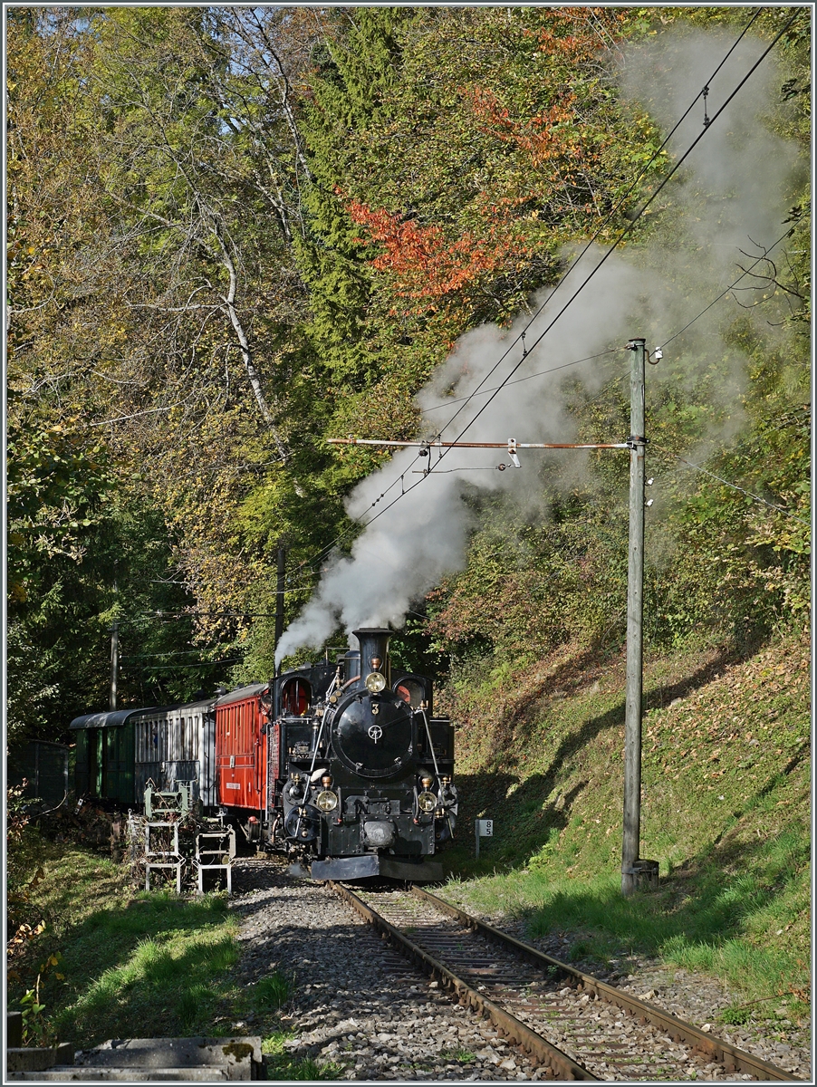 La Dernière du Blonay - Chamby - das 50. Jahre Jubiläum beschliesst die Blonay Chamby Bahn mit einer Abschlussvorstellung und dies mit viel Dampf: Davon sieht man auf dem Bild nicts, dafür um so mehr den Rauch und ohne Frage der Dampfzug kommt!