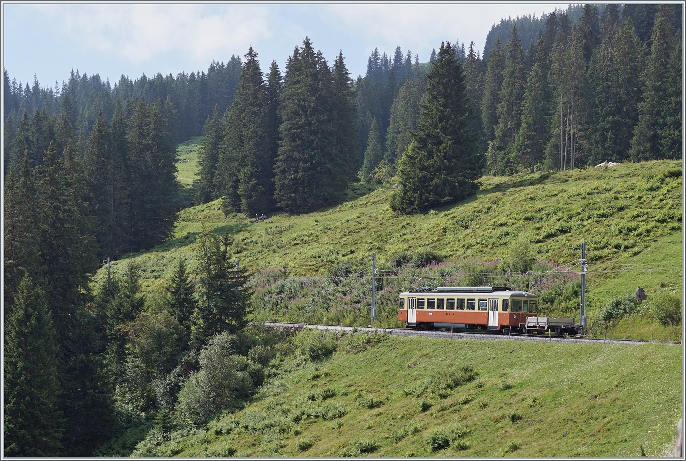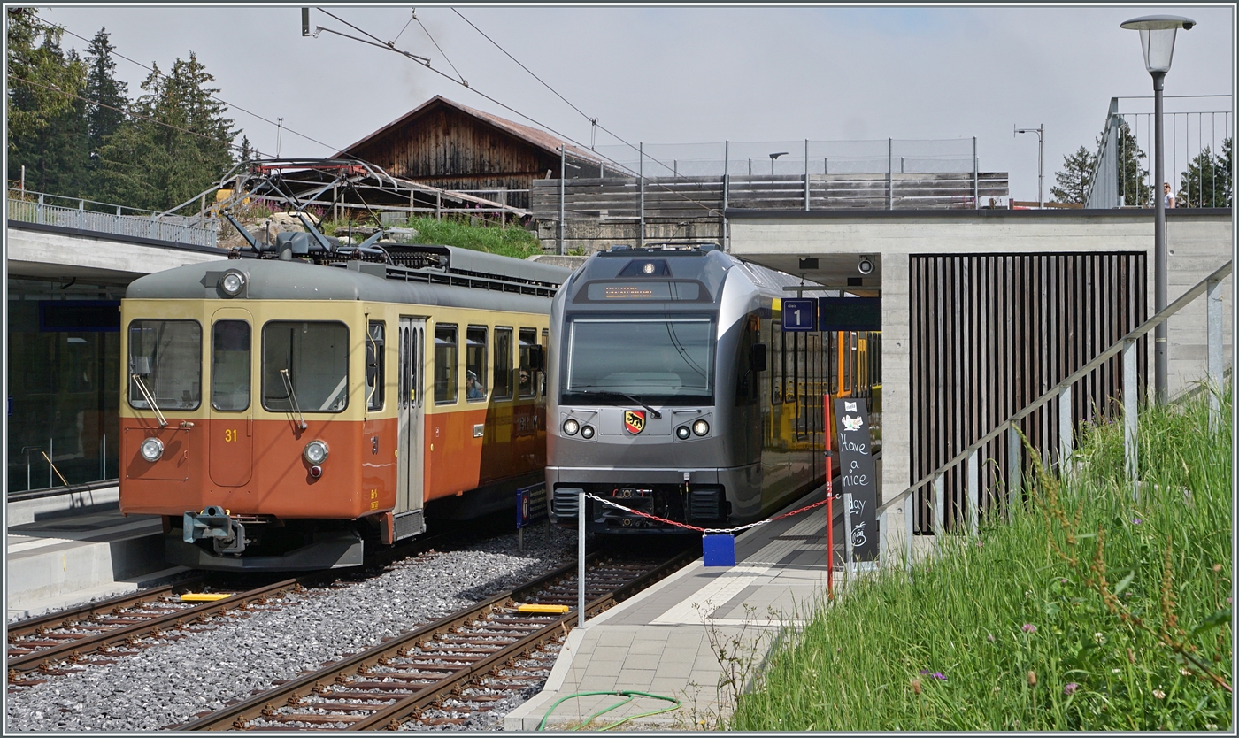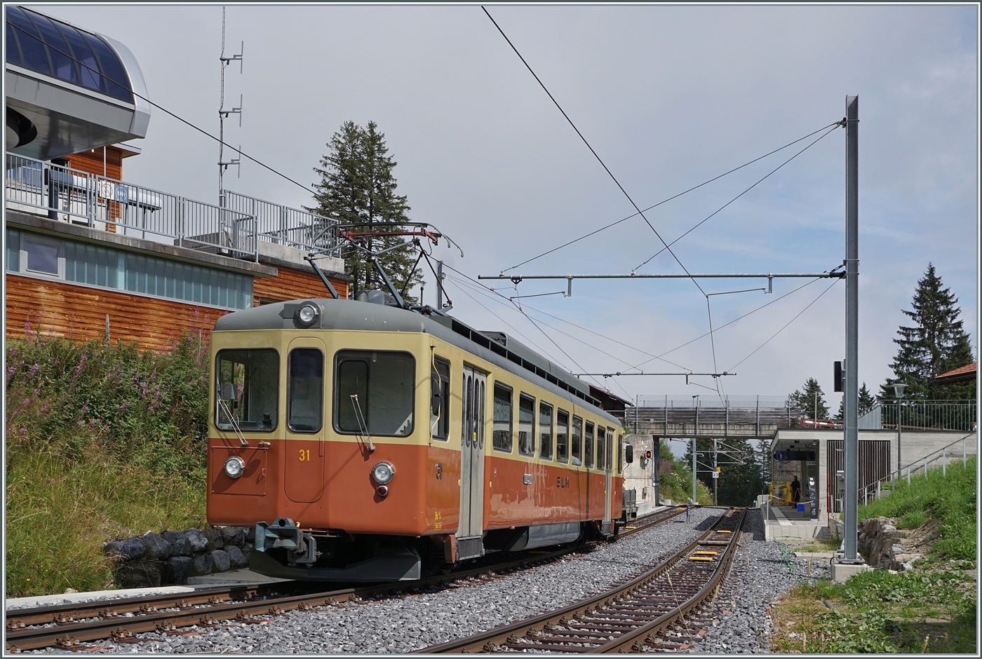 "Il était une fois... les années 40 / Es war einmal: die 40er Jahre" - Schwach ausgelastete Verbindungen konnten mit den neuen modernen Triebwagen kostengünstig ohne Wagen und Rangiermanöver angeboten werden. Der GFM Historique Ce 4/4 131 (Baujahr 1943) wartet in Cornaux auf die Abfahrt. Der Triebwagen ist auf der Fahrt von Blonay nach Chaulin via Chamby.