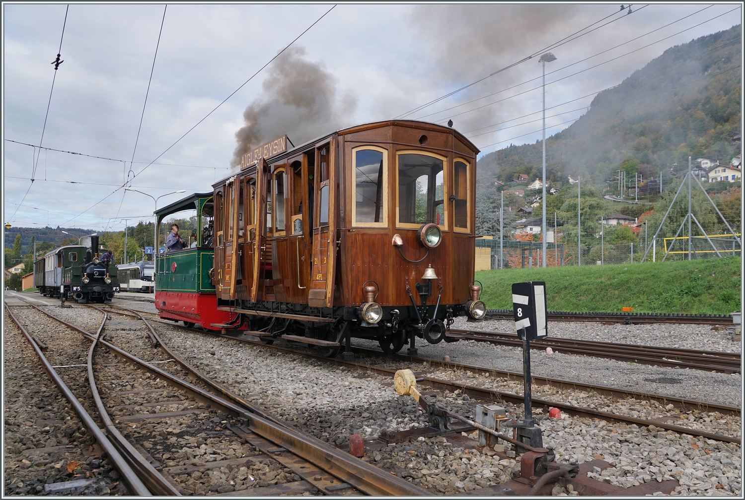 Der elektrische Personentriebwagen mit Gepäckabteil A.S.D. BCFe 4/4 No.1 «TransOrmonan» mit dem zweiachsigen 3. Klasse Personenwagen A.S.D. C² 35 erreicht, am Morgen des 9 September 2023 als erster Zug der Museumsbahn des Tages, nun den Bahnhof Blonay. Beide Fahrzeuge sind Baujahr 1913.