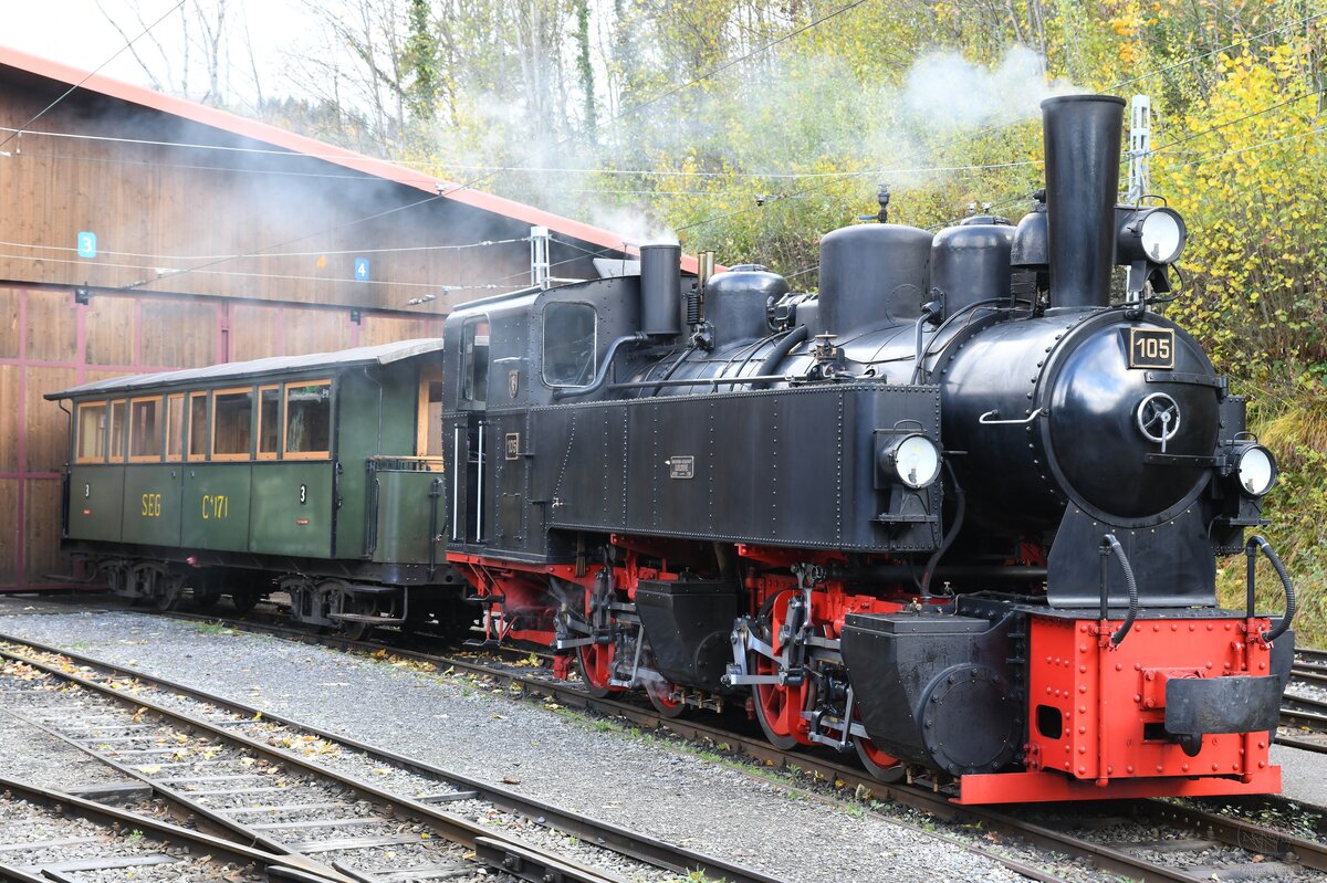 Die Mallet-Dampflok G 2x2/2 SEG 105 "Todtnau“ fährt am 27.05.2023 mit dem Dampfzug der Museumsbahn Blonay-Chamby von Bahnhof Blonay nun wieder hinauf nach Chamby bzw. zum Museum Chaulin.
