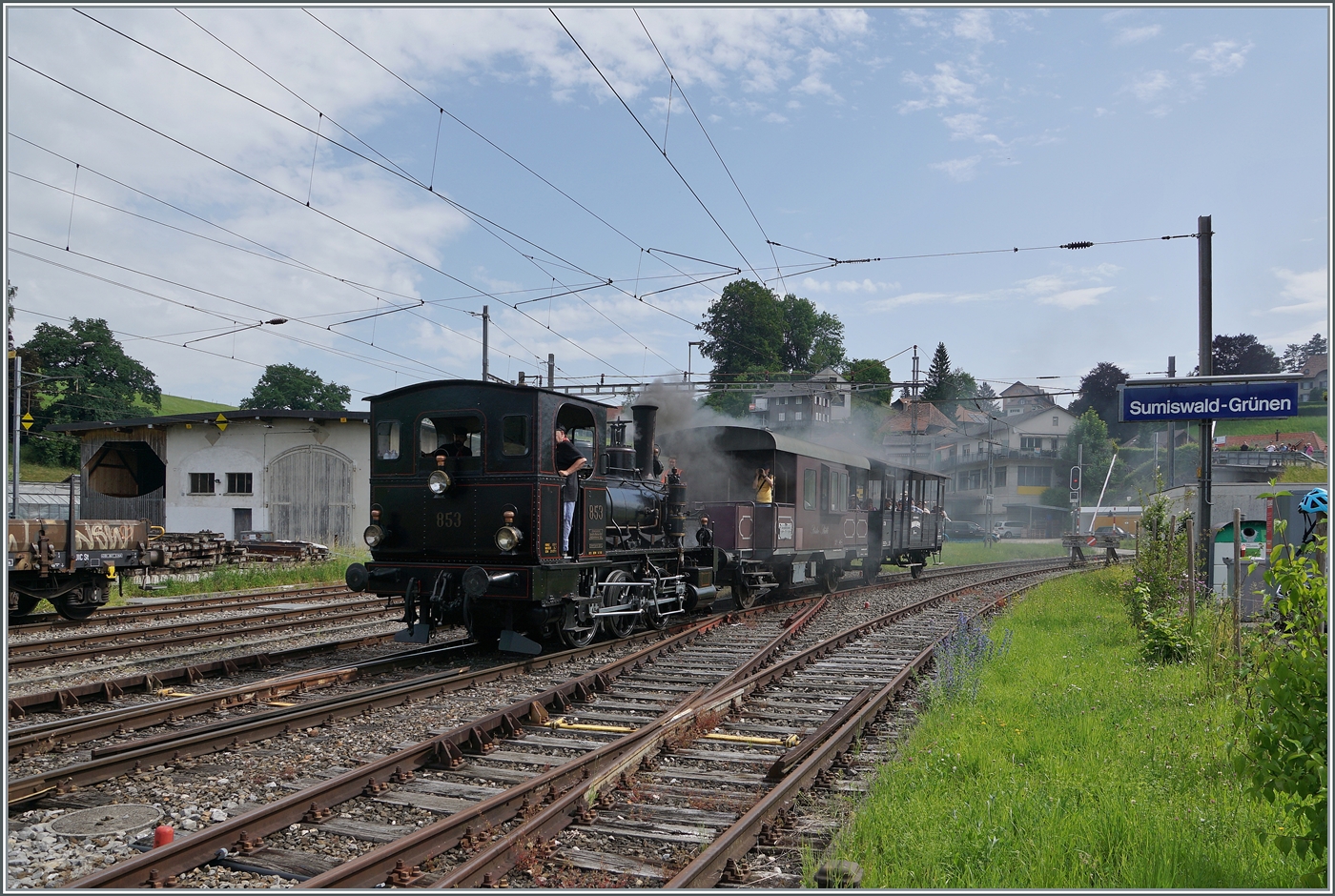Der Emmentalbahn Dampfzug mit der E 3/3 N° 853 der Dampfbahn Bern (DBB) erreicht von Wasen i.E. kommend sein Ziel Sumiswald-Grünen.