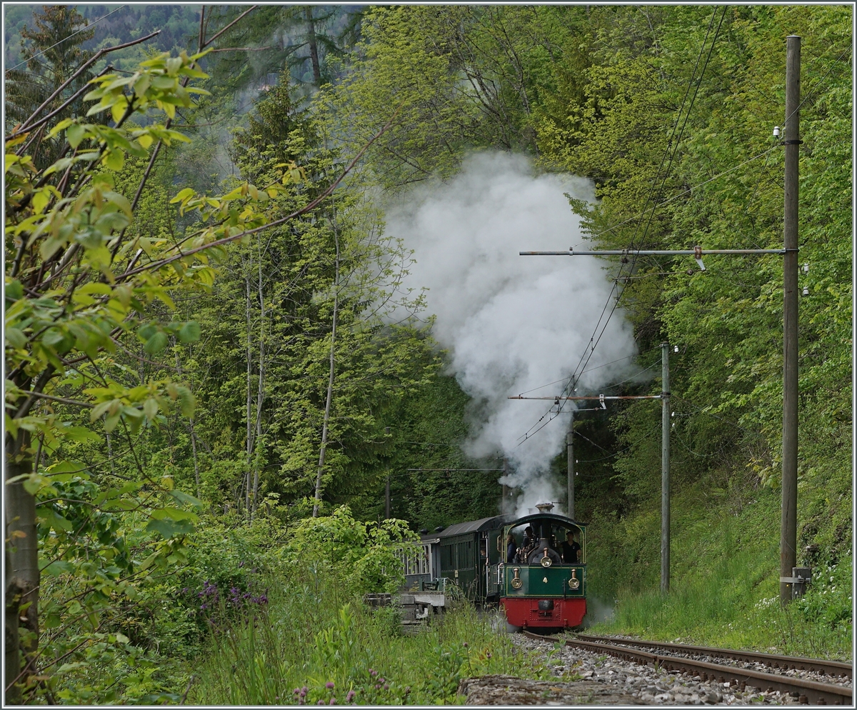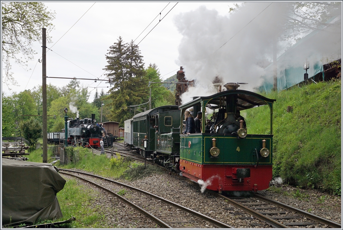Der 1. bis 3. Klasse vierachsige Großraumwagen mit Gepäckabteil ABCFZ 15 der Museumsbahn Blonay-Chamby, ex RB ABCDF 15 (Réseau Breton), am 27.05.2023 im Zugverband im Bahnhof Blonay.