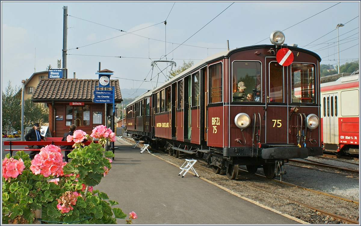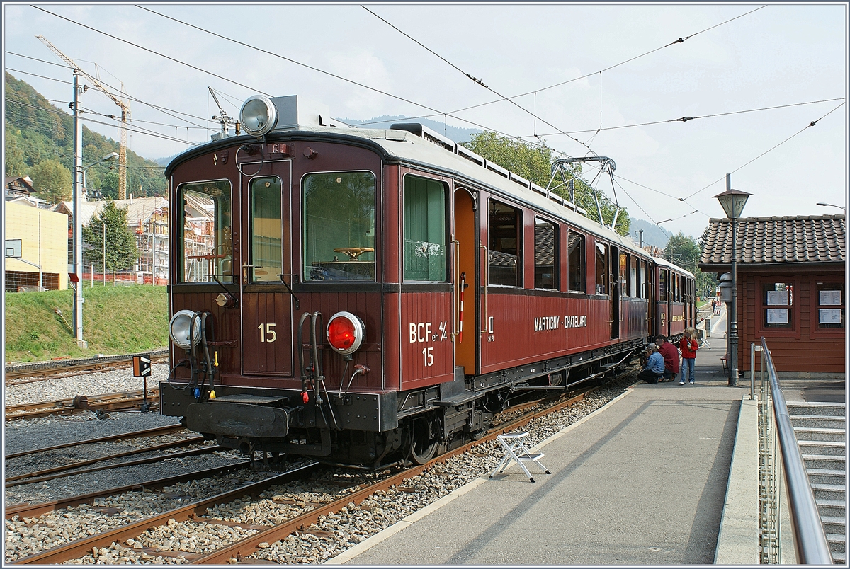 Der historische Martigny - Chatelard (MC) BCFe 4/4 N° 15 mit dem BFZt4 75 wartet anlässlich des Blonay - Chamby Themenveranstaltung "Le Valais en fête sur la BC" in Blonay auf die Abfahrt nach Chaulin. 26. Sept. 2009