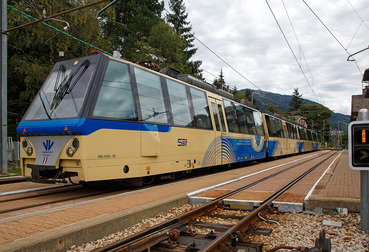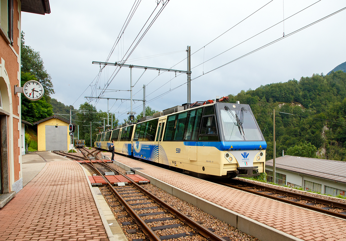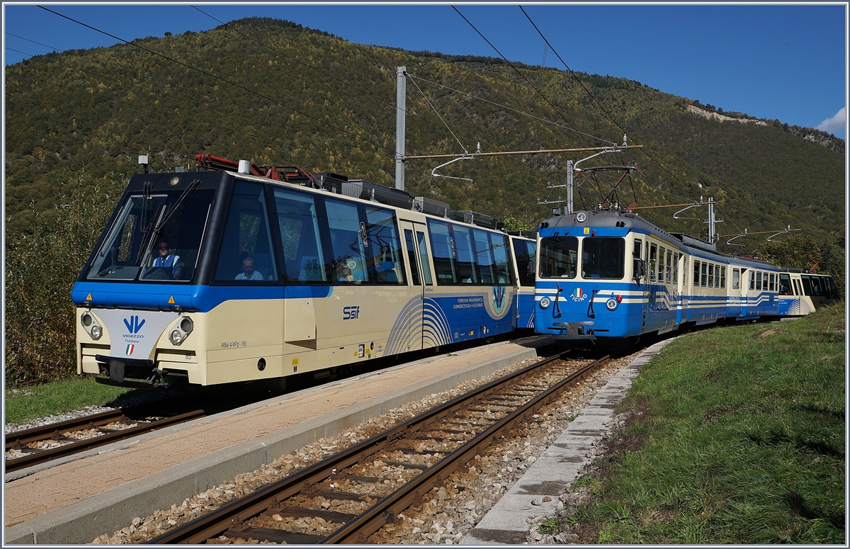 Der SSIF der ABe 12/16 (ABe/P/Be/Be) N° 85 "Trontano", als SSIF Treno Panoramico 43 von Domodossola nach Locarno unterwegs, kreuzt in Intagna den FART ABe 4/6 53, der als Regionalzug 310 von Locarno nach Camedo fährt.