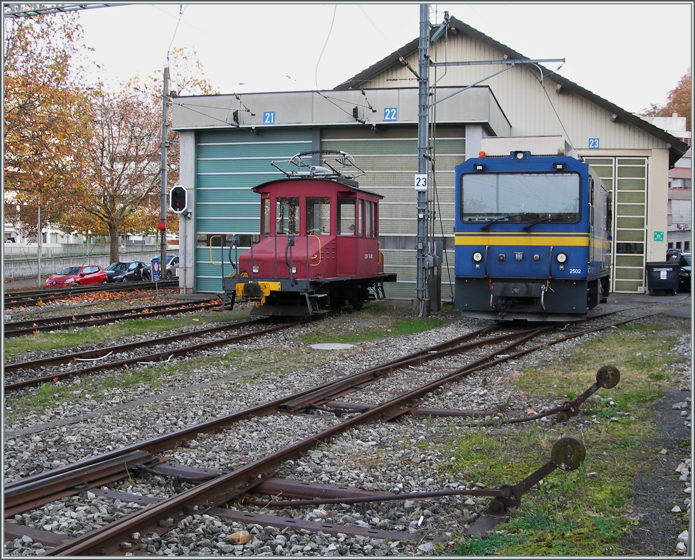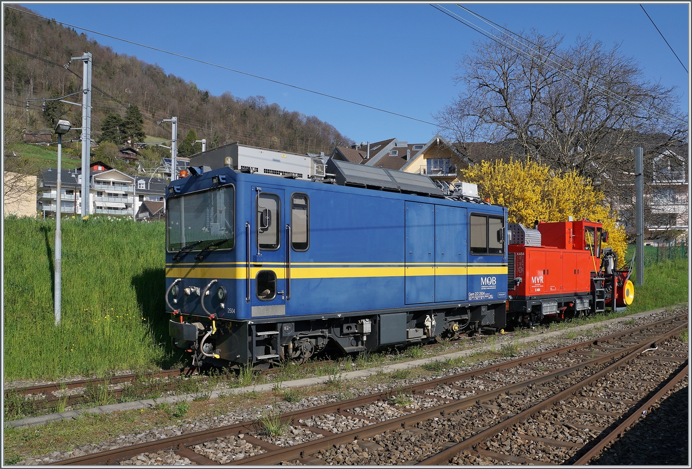 Ungewohnt und so funktioniert es natürlich nicht: die MOB Gem 2/2 2504 steht mit der CEV X464 in Blonay.