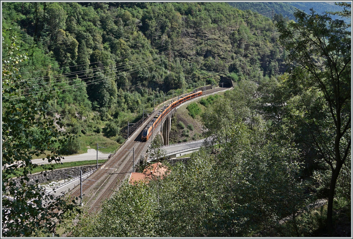 Erneut ein SOB TRAVERSO, der RABe 526 212 auf dem Weg nach Locarno. Der Zug befindet sich kurz vor dem oberen Eingang in den 1567 Meter langen Pratotunnel, der als 360 ° Kreiskehrtunnel ausgeführt ist.