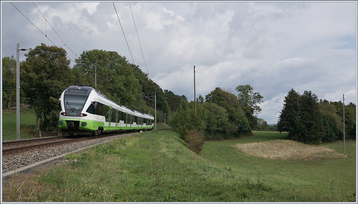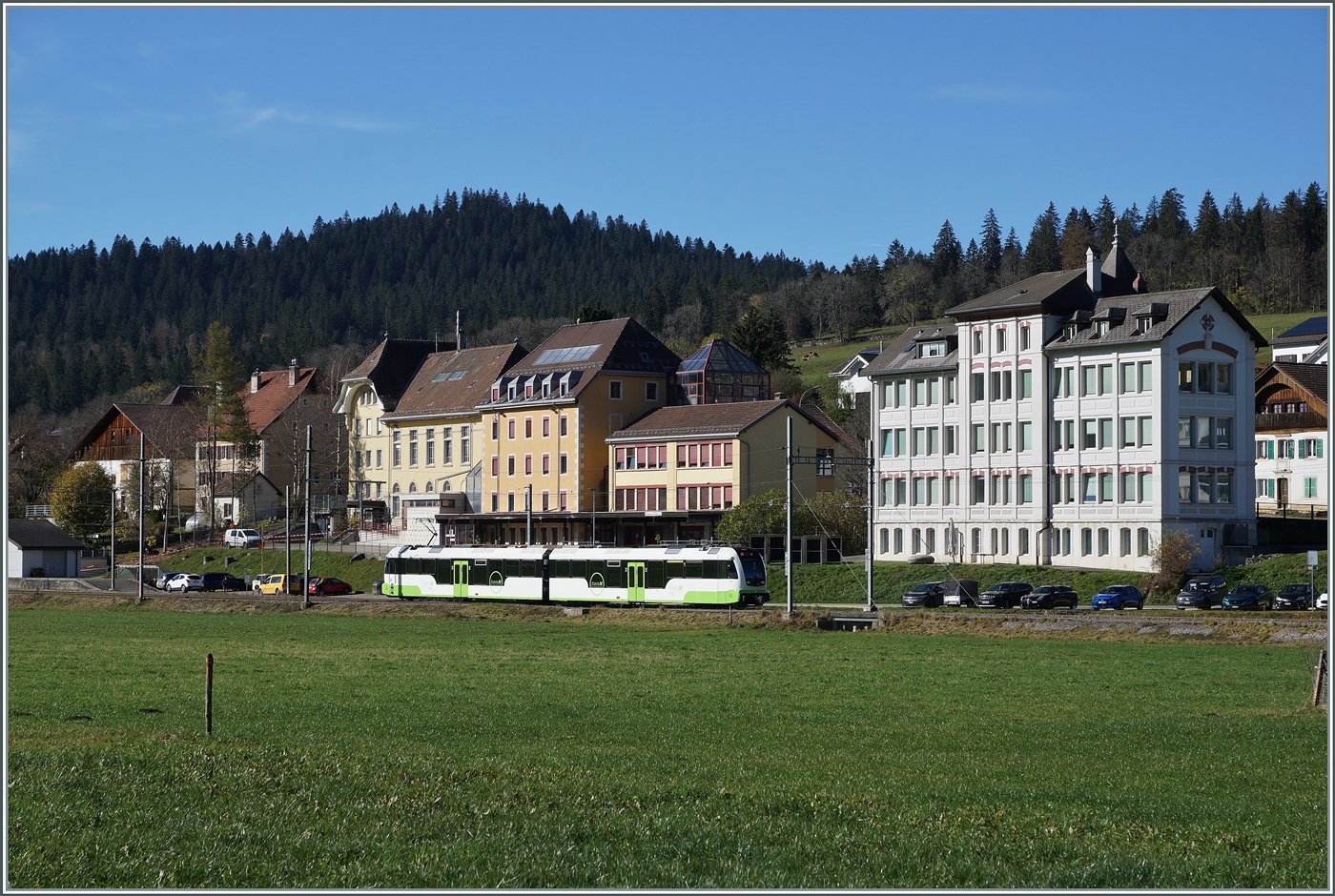 Der transN ABe 4/8 N° 9 verlässt La Sagne in Richtung La Chaux de Fonds.