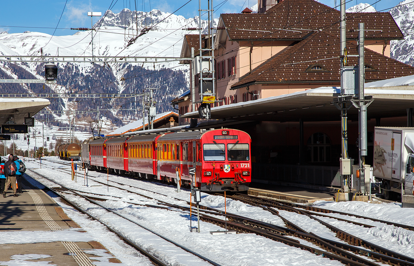 Der RhB Steuerwagen mit zweite Wagenklasse- und Gepäckabteil BDt 1721, als Steuerwagen von einem RhB Regio der Engadinerlinie (Pontresina - Sagliains - Scuol-Tarasp), am 20 Februar 2017 im Bahnhof Pontresina.