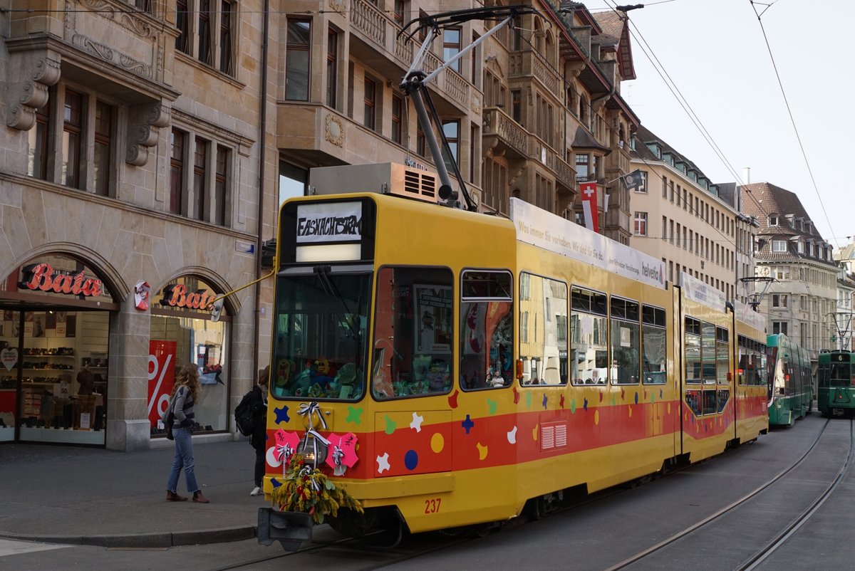 Der BVB Be 6/8 313, ein siebenteiliger Siemens Combino der Basler Verkehrs-Betriebe als Linie 8, windet sich am 28.12.2017 in Weil am Rhein durch die Wendeschleife.