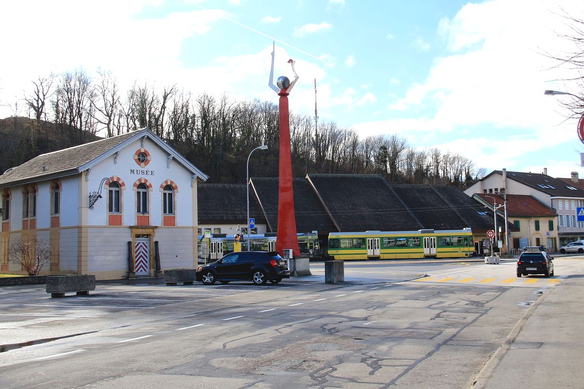 Zug 554-504 in Colombier unter der zum Schloss führenden uralten Baumallee. 23.Januar 2018