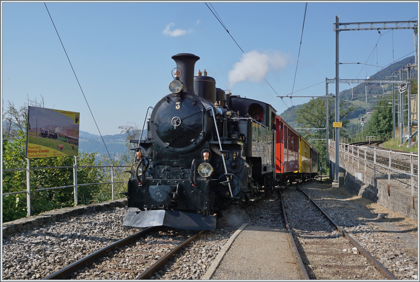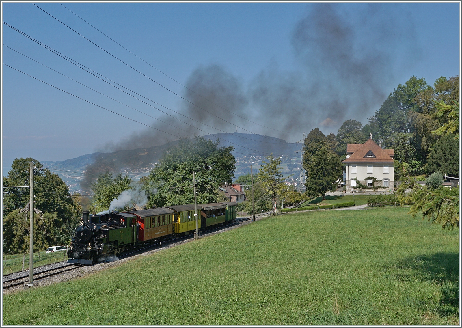 "Le Chablais en fête" bei der Blonay Chamby Bahn. Die Eröffnung des ersten Teilstückes der Bex - Villars vor 125 Jahren, sowie die vor 80 Jahren erfolgte Fusion einiger Strecken im Chablais war der Anlass zum diesjährigen Herbstfestivals "Le Chablais en fête" bei der Blonay-Chamby Bahn. Als besondere Attraktion zeigt sich der ASD BCFe 4/4 N° 1 "TransOrmonan" der ASD mit seinem C² 35 als Gastfahrzeug. Das Bild zeigt den 1913 gebauten und 1941 umgebauten BCFe 4/4 N° 1 auf der Fahrt von Museumsbahnhof nach Blonay bei Chaulin.