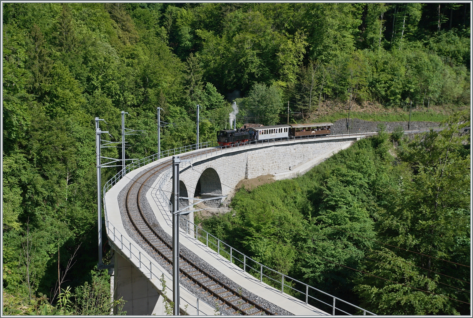 La DER 2019 (Saison Abschluss 2019) Mit einem farblich einheitlichen Zug ist die SEG G 2x 2/2 105 der Blonay - Chamby Bahn im Herbstlichen Wald bei Vers-Chez-Robert auf dem Weg nach Chaulin.