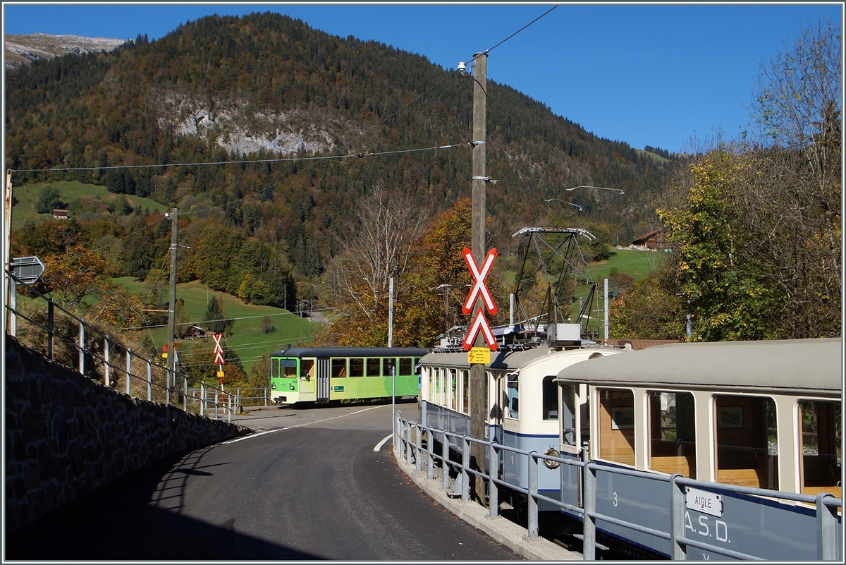 Der BCFe 4/4 1 und BDe 4/4 mit einem Extrazug auf der Fahrt nach Aigle bei Les Planches (Aigle) am 18. Oktober 2014 Stefan Wohlfahrt