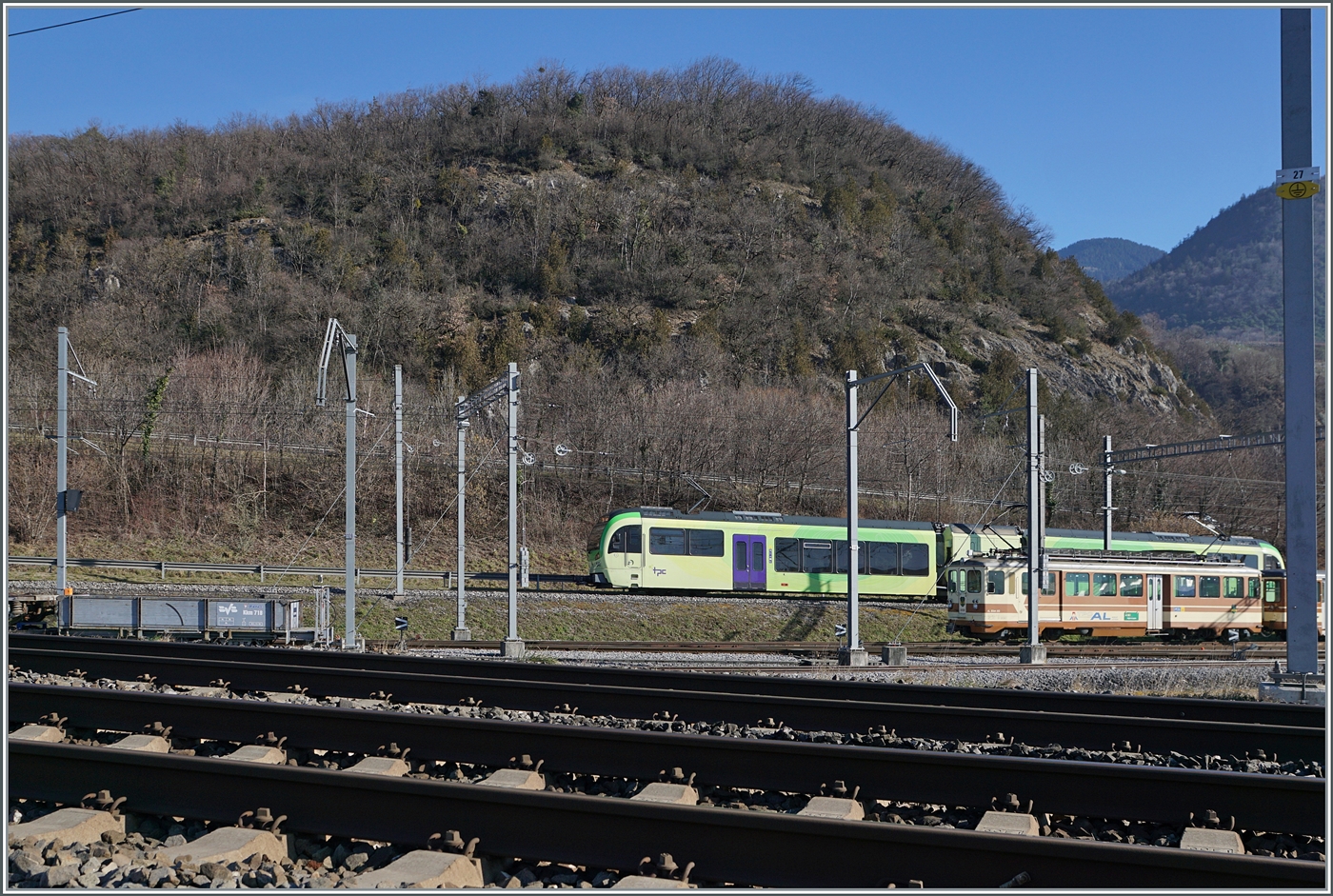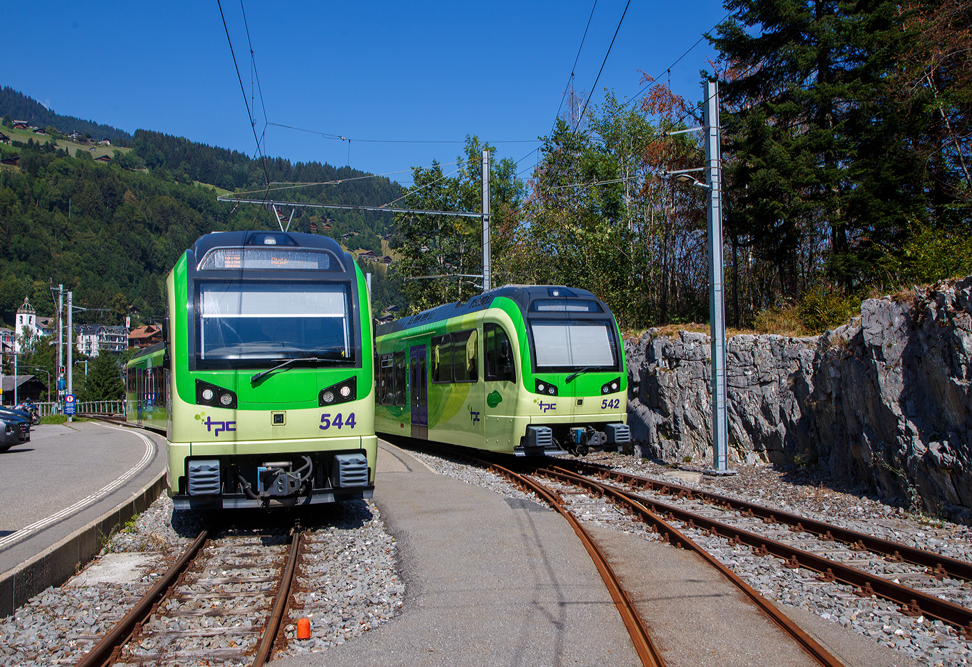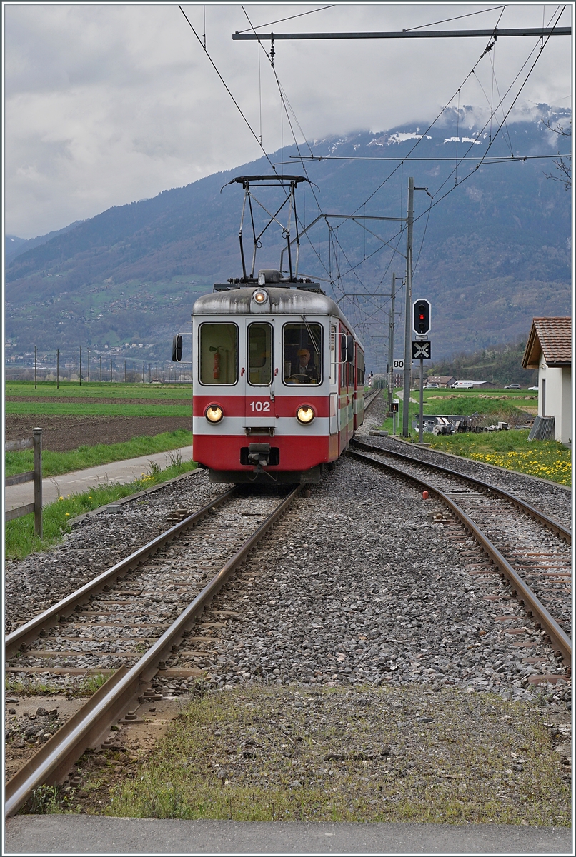 Die Reisenden und der AOMC Beh 4/8 592 warten in Ollon auf den (Gegen)-Zug nach Aigle.
