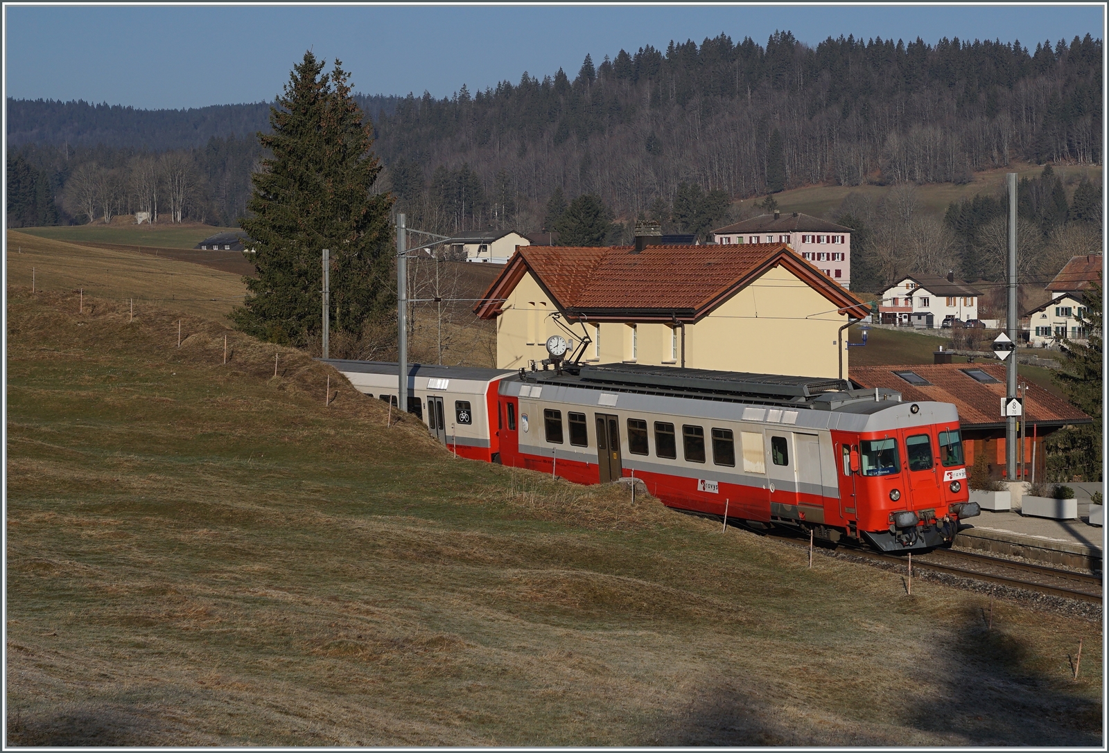 Ein Blick ins Areal der CTVJ (Compagnie du Train à Vapeur de la Vallée de Joux) mit dem im Vordergrund in Le Pont ankommenden SBB RABe 523 025 von Ailge nach Le Brassus.