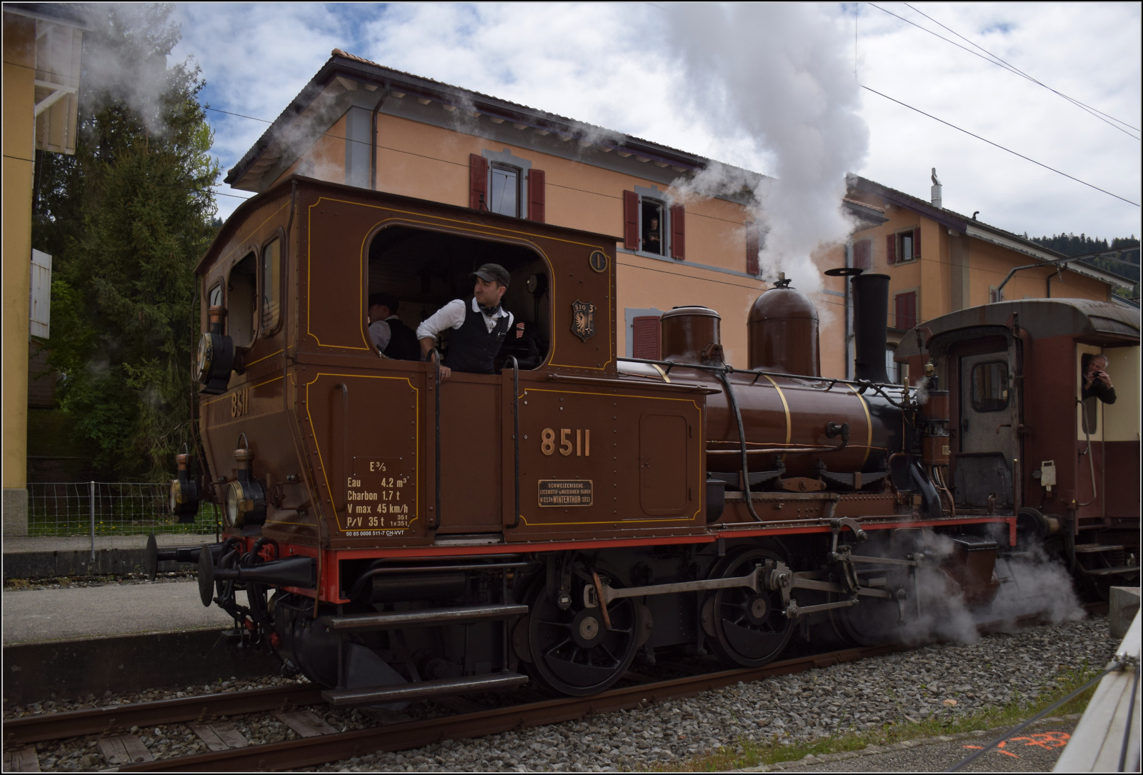 Echte Dampflok-Bewunderer kleiden sich offenbar in Schwarz, selbst wenn die Dampflok braun ist. Die Wasserbüffel gegenüber La Presta sind richtige Fans, obwohl der Zug einen halben Kilometer entfernt vorbeifährt, manchmal wird auch zügig an eine bessere Aussichtsposition gewechselt. Mai 2024. Olli