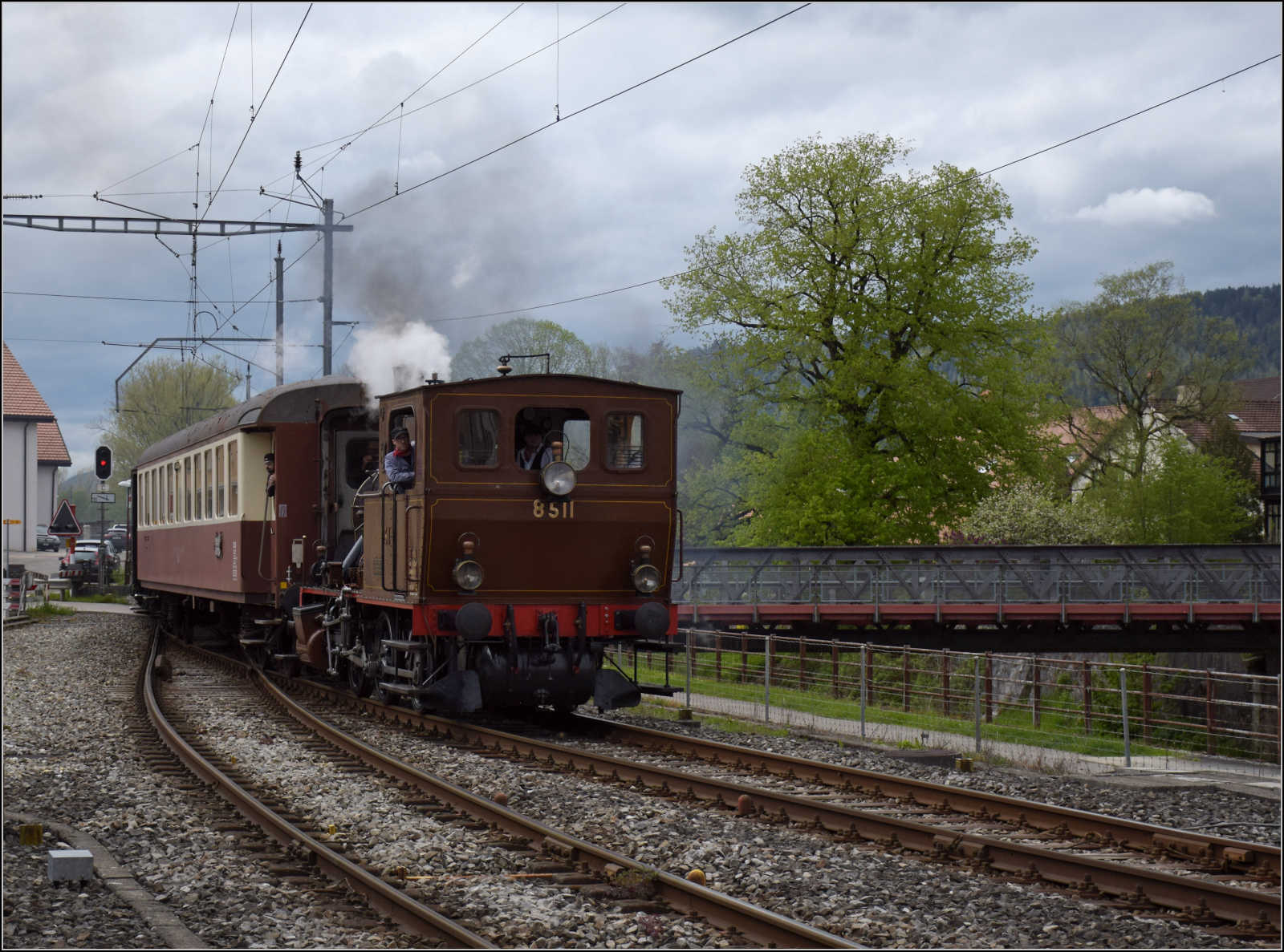 Vor dem Streckenumbau noch eine Besichtigungstour im Val Travers. Die E 3/3 5811 in Couvet. Mai 2024.