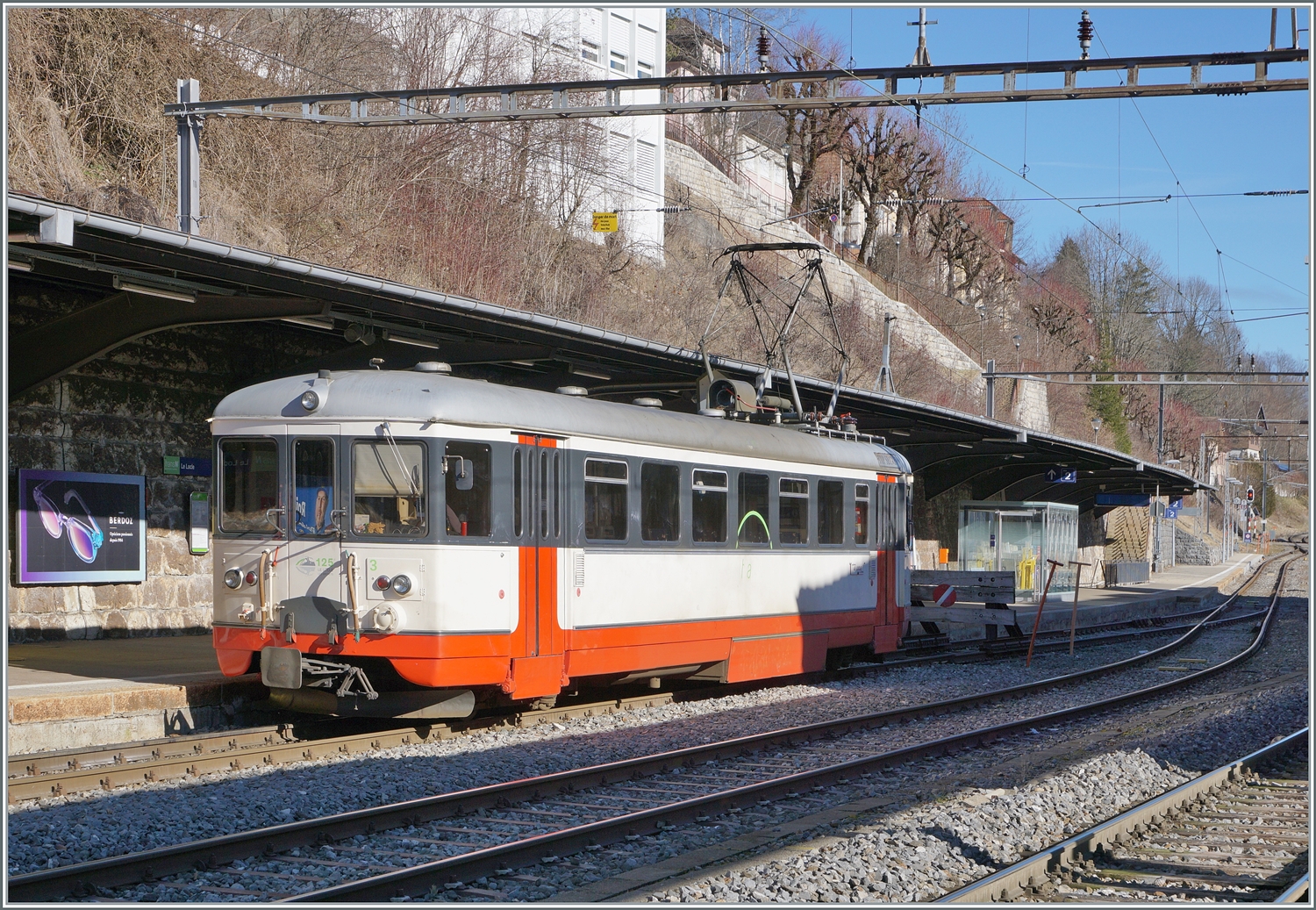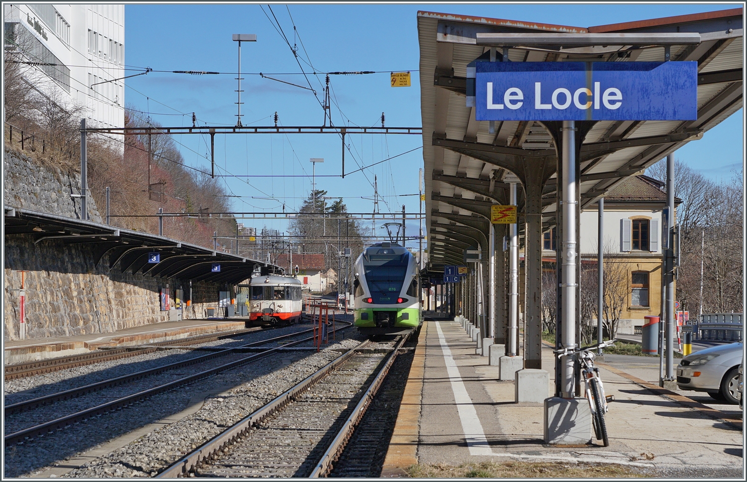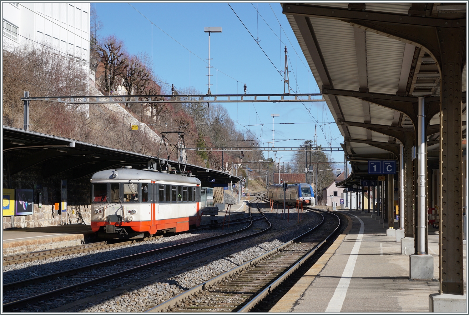 BDe 4/4 5 der "Régional des Brenets", heute TransN, hat bald ausgedient und ein Bus wird auf der Bahnstrecke fahren. Schutz durch James Bond wird auch nicht mehr nötig sein. Le Locle, Mai 2023.